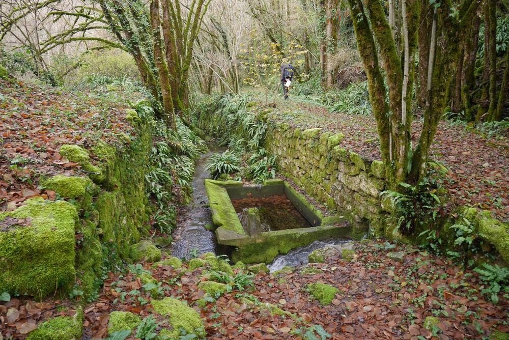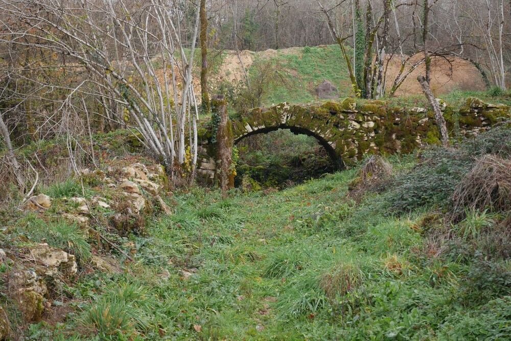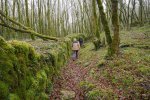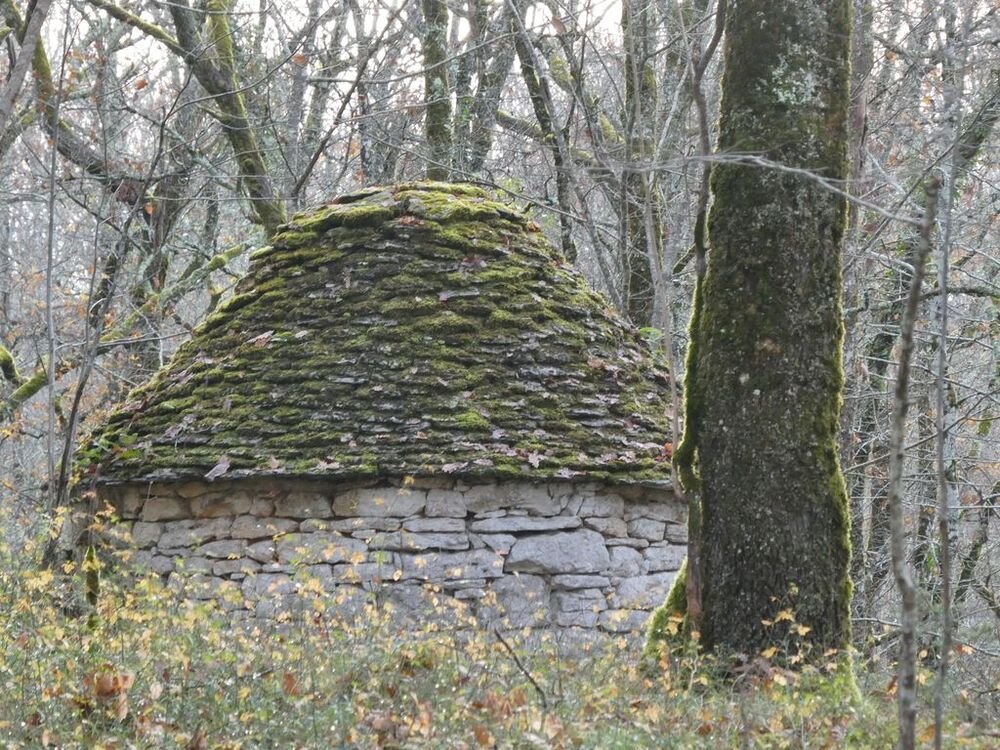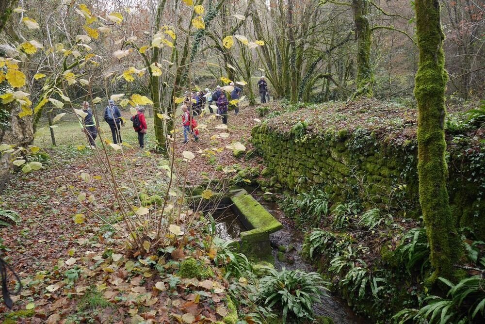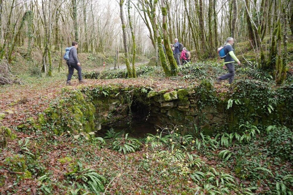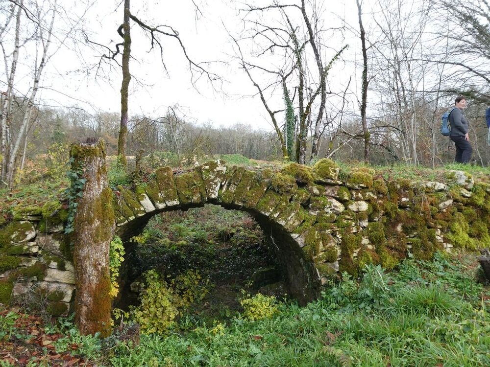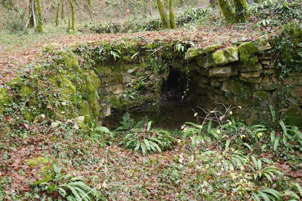 Après l’avoir quitté nous nous dirigeons plein nord et arrivons à Mazières, commune de Montcabrier. Par un chemin recouvert d’un tapis de feuilles de châtaigniers nous descendons jusqu’au captage de la source au pied de laquelle se trouve un lavoir entouré d’une multitude de fougères. Nous entrons ensuite dans le fond du Ravin de Lanau ! Nous le remontons en suivant le magnifique chemin creux bordé d’un muret de pierres moussues, et ouvert grâce au travail de nettoyage accompli par nos camarades « Copines et Copains des bois ».