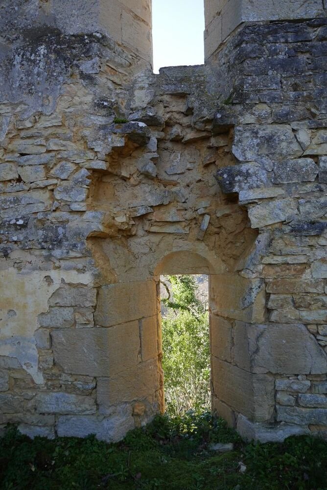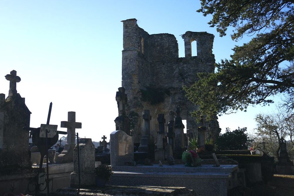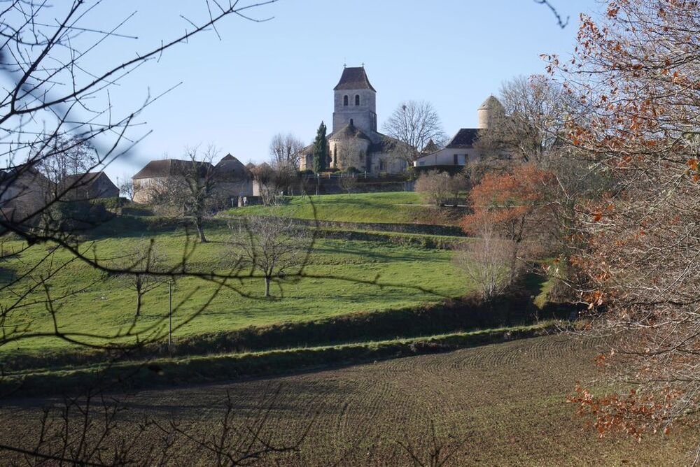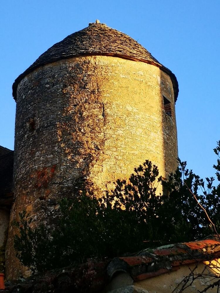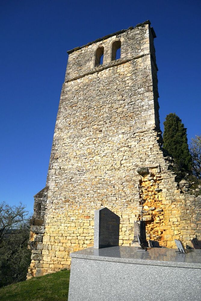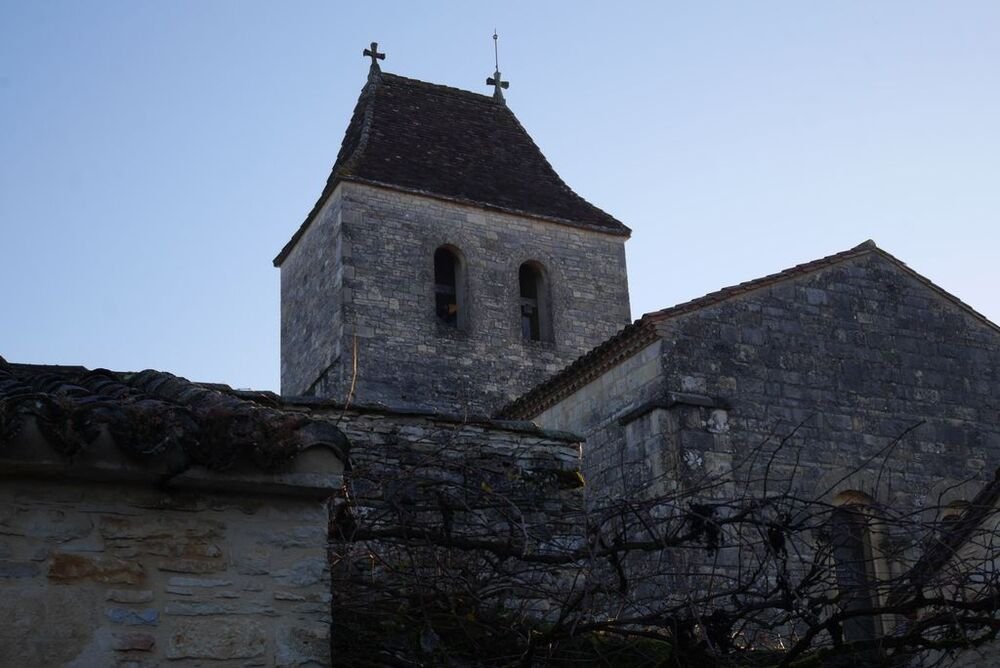 Dans la descente , après un ancien séchoir à tabac, un chemin enherbé bordé de murs en pierres sèches nous conduit à une croix et au ruisseau du Divat . Celui-ci témoigne d’une présence gauloise, dérivant de Divona, déesse des eaux. D’ailleurs, un ancien lavoir et la retenue d’eau d’un moulin attestent de l’humidité des lieux ( tout près, zone humide protégée) . Quittant cette petite route, nous nous engageons dans les bois et bientôt , sur notre gauche se dressent les silhouettes de l’église des Arques et de la tour du Doyen ainsi que, sur le pech de Ladoux , les vestiges de l’ancienne église St Martin en ruine dont les pierres ont permis de restaurer l’église actuelle entre 1803 et 1819.