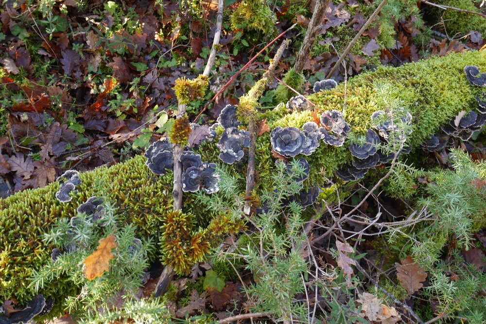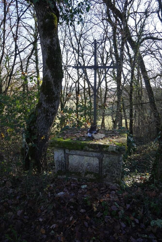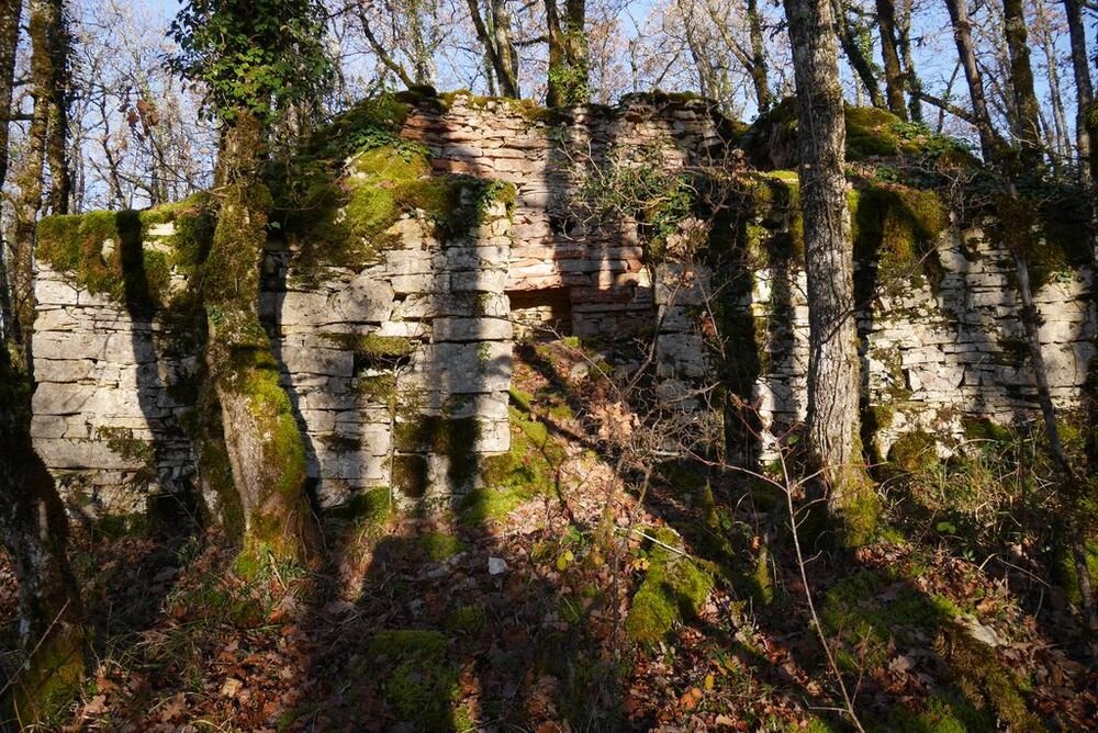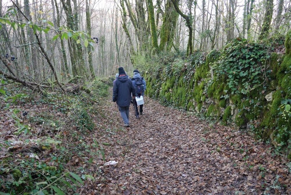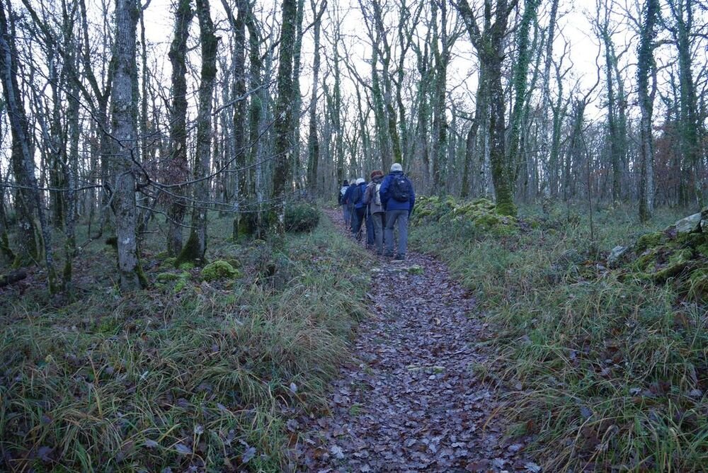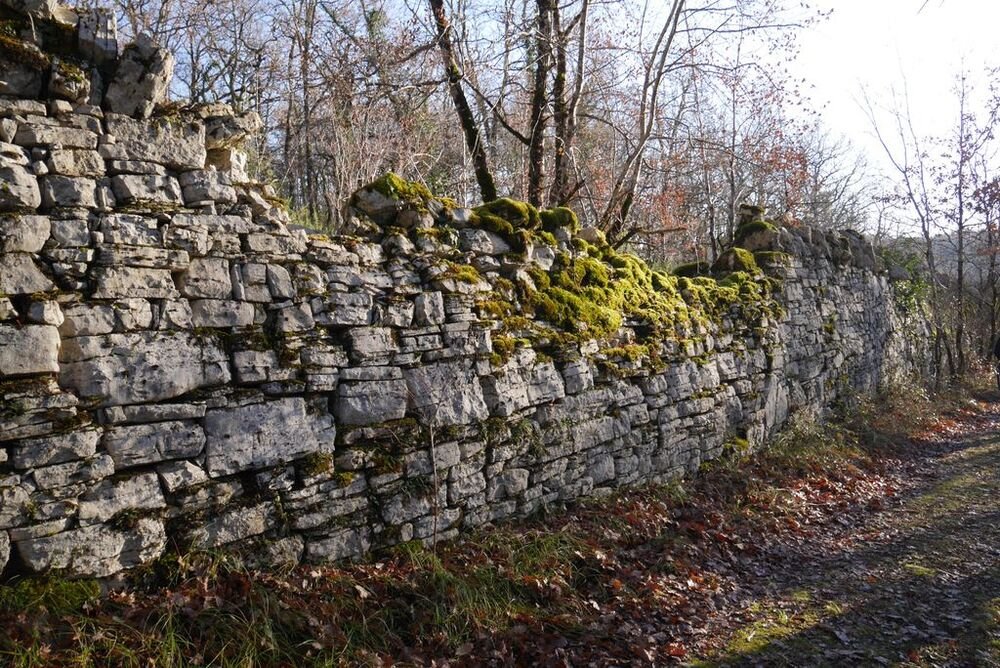 Commence alors un long cheminement à travers bois , dans des sentes encaissées et boueuses puis sur des chemins plus durs où les chênes occupent ce territoire de causse . Enfin nous atteignons un carrefour de voies larges et empierrées : la pierre est omniprésente en ces lieux...Ainsi, après avoir pris sur notre droite un chemin en pente, notre regard est attiré par un mur en moellons , édifié sous le 1er Empire par des prisonniers de guerre polonais .