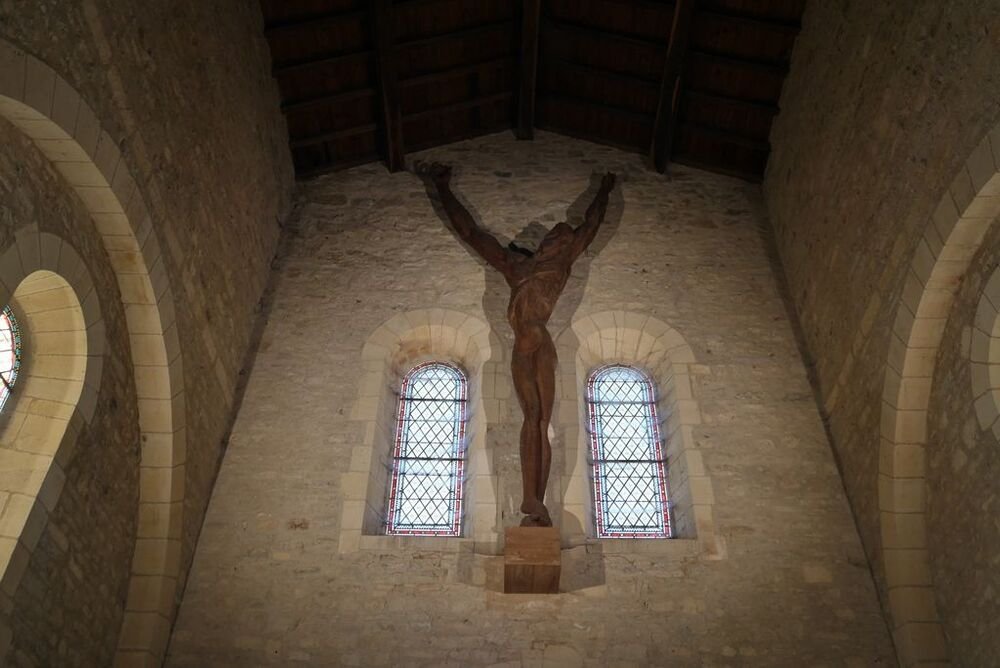 – dos au chœur, notre regard découvre le Christ équarri et taillé directement dans un orme par Zadkine ( 1938- 1940) . Le bois est naturel et le Christ est lui-même la croix ( 5, 37m sur 3, 00m)