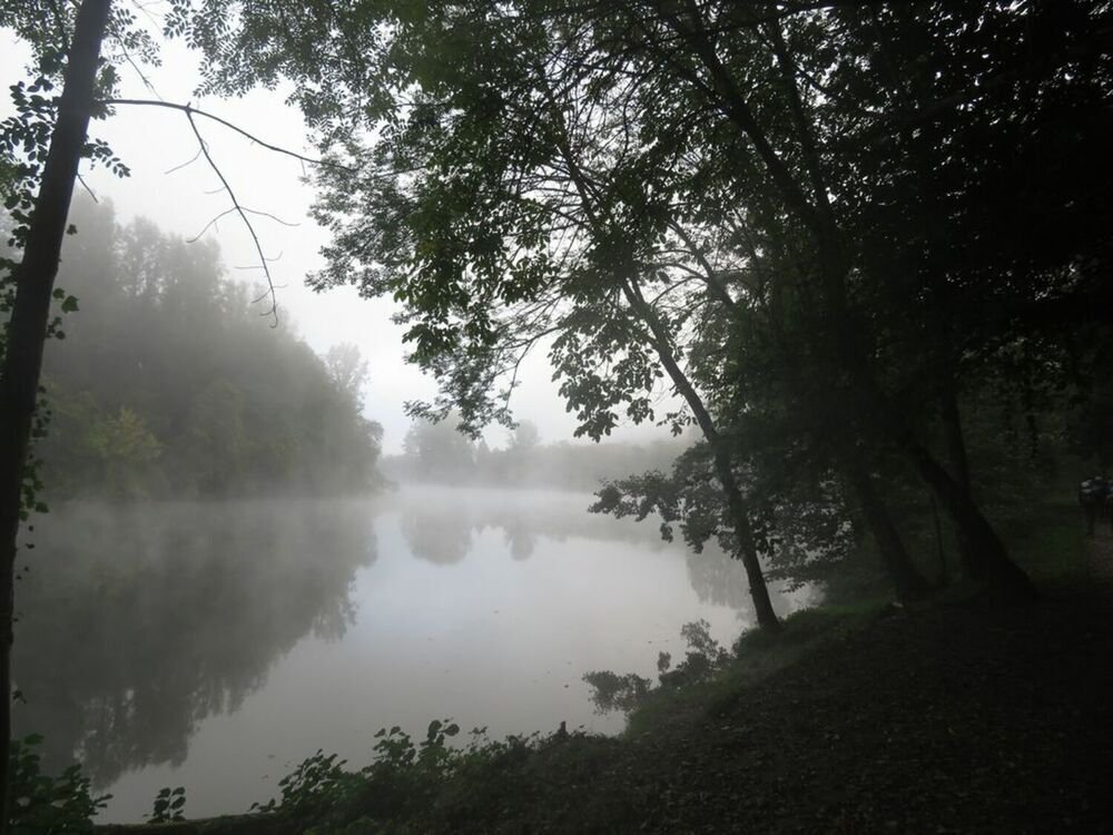 Le village hissé sur son éperon rocheux se mire voluptueusement dans les eaux calmes du Lot, à travers des brumes légères. A ses pieds, le chemin de halage que nous empruntons en direction de Rivière Haute et ses nombreux coins de pêche.