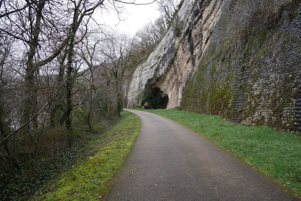 La troupe, renforcée par deux jeunes pouces en vacances, se dirige, cap plein ouest, en direction de Touzac, sur l’ancienne voie ferrée transformée en voie verte, le long du Lot, en suivant les anciennes infrastructures ferroviaires (garde-barrières, ponts en brique rouge, imposants murs de soutènement ruisselant d’eau), sous la barre calcaire de l’ancien lit de la rivière.