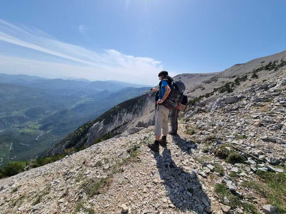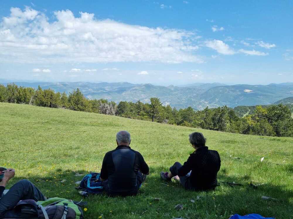 Nous continuons sur le tracé du GR tout en restant sur la crête jusqu’à la Tête de la Grave. Ensuite, la végétation réapparaît et les effluves de nombreux pins nous embaument les narines… Au pas de la Frache nous obliquons vers l’épaulement de la Frache et nous faisons, à l’ombre devant une magnifique vue, la pause pique-nique bien méritée…