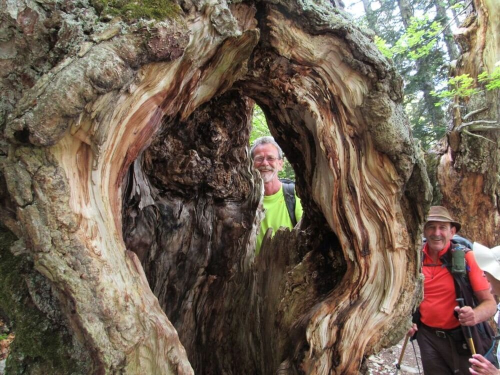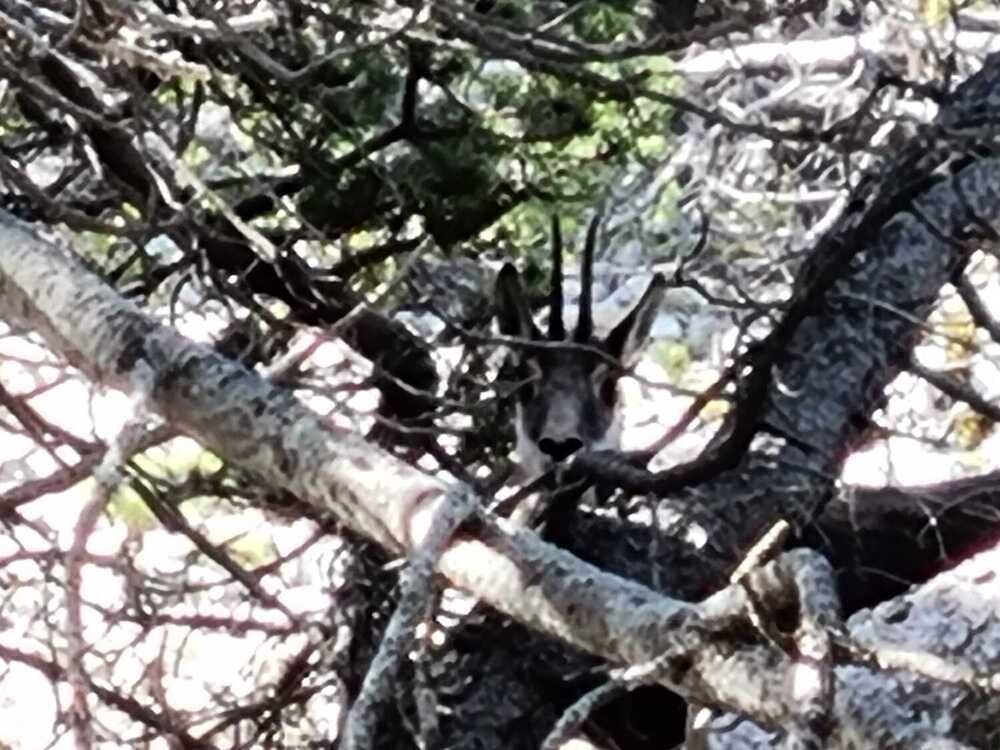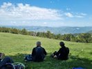 Nous montons progressivement en lacets à travers les hêtres et les mélèzes pendant une heure et demie, mais sans trop de souffrances car le chemin n’est pas trop raide… Au détour d’un virage, magie de la nature, tranquillement installés à l’ombre broutent une femelle chamois et son petit. Encore quelques efforts et nous découvrons, après nos 500 mètres de dénivelé, ce panorama époustouflant qui s’ouvre à nous sur les 360°…