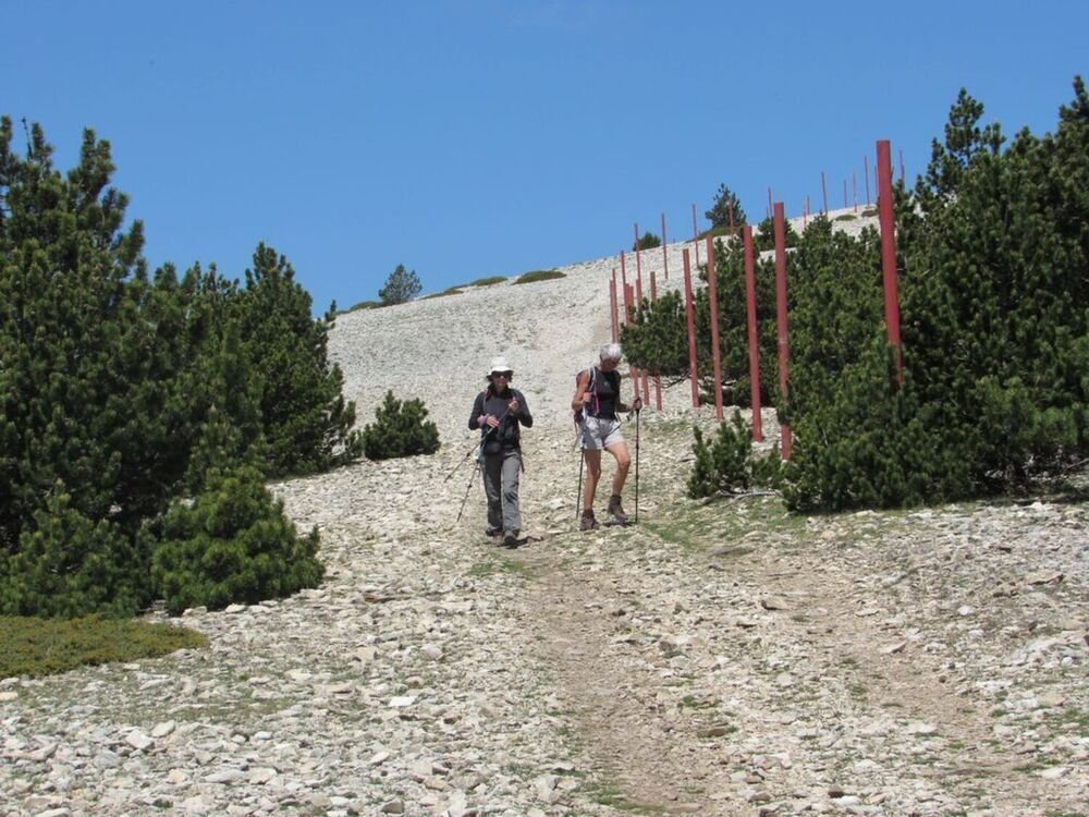 La route du Mont Ventoux vers le Mont Serein nous met déjà dans l’ambiance : un beau serpent de macadam, en virages bien relevés, est bordé de magnifiques épicéas, pins, cèdres et sapins pluri-centenaires. Nous sommes surpris de sa fréquentation par les professionnels du cyclisme : la qualité de leur matériel, leurs tenues et l’énergie qu’ils déploient sous cette chaleur ne font aucun doute. Ils sont rois dans ce contexte et mieux vaut le savoir !