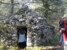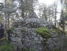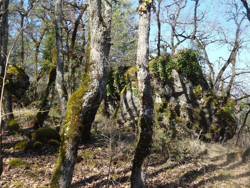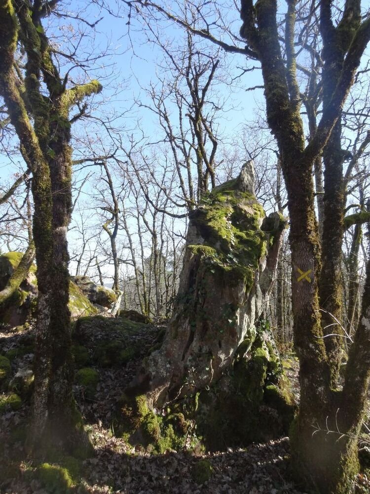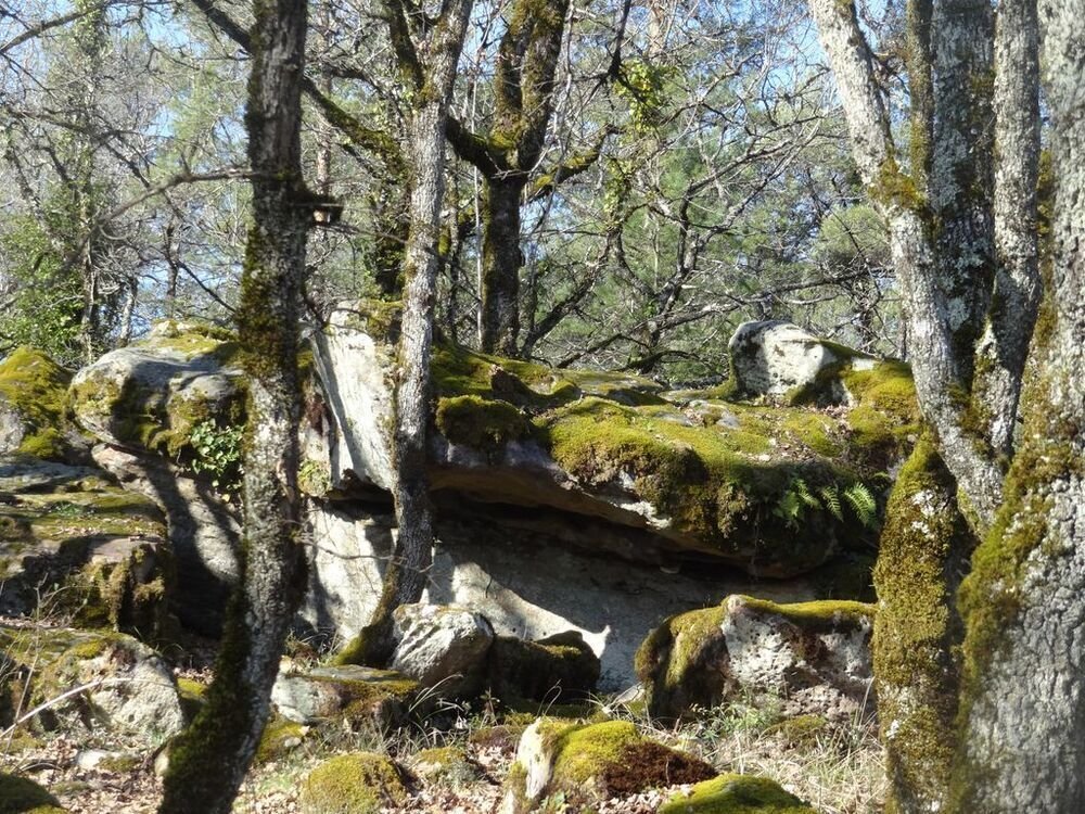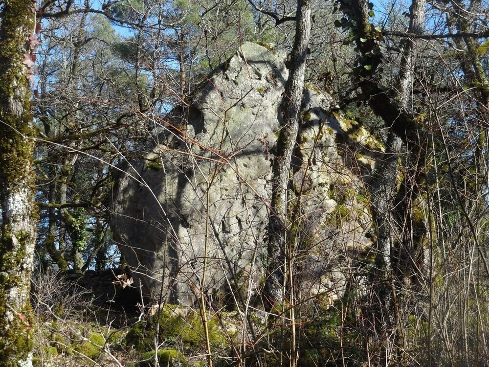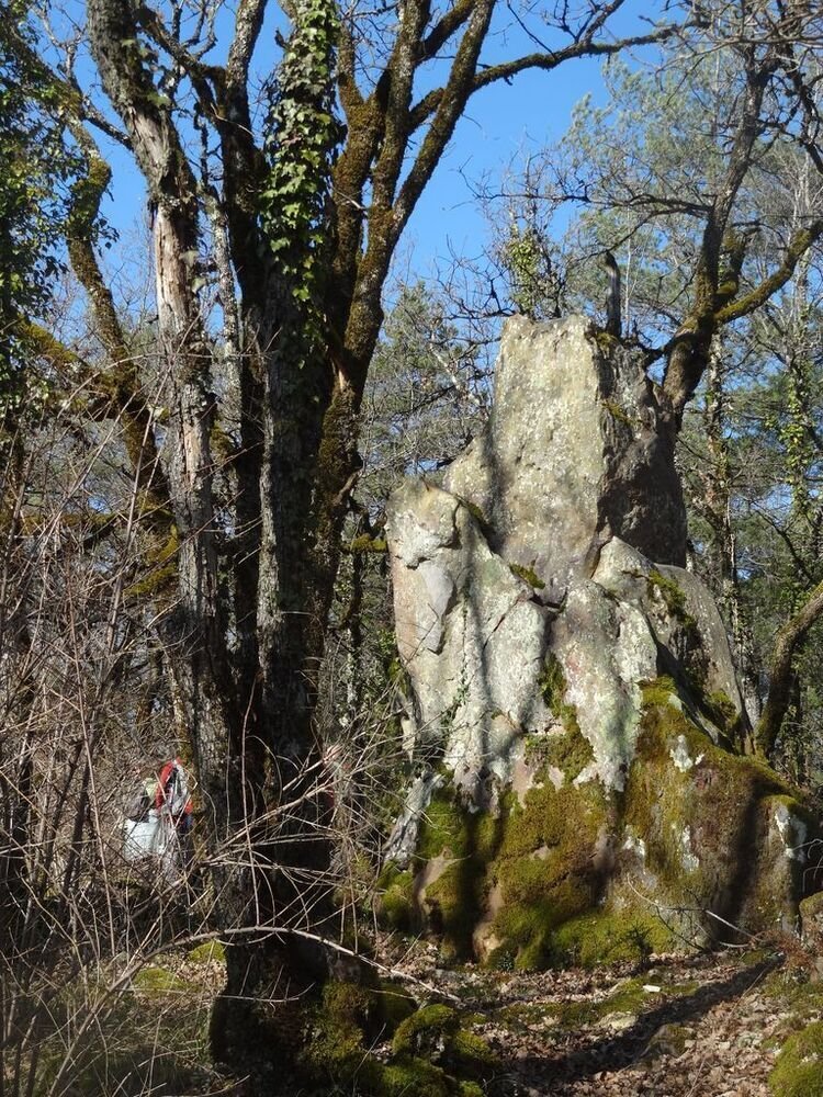 Nous arrivons après une légère montée sur un chemin parsemé de gariottes, au amas de Roquebert, composé de blocs granitiques, dont l’origine est la cimentation des altérites sableuses par précipitation et cristallisation de la silice. Ce lieu, résultat d’une alchimie complexe de la nature, a de tout temps, présenté un caractère sacré, source d’énergie.