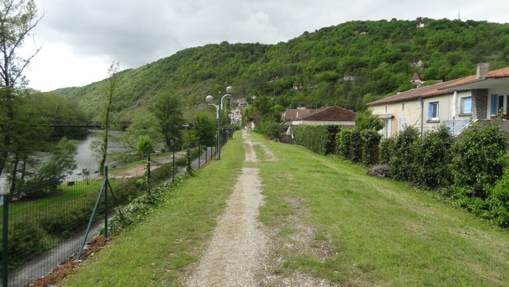 Départ de la bastide de Castelfranc sur le délaissé ferroviaire, traversée du confluent entre le Vert et le Lot, passage à proximité de l’écluse de Castelfranc, direction sud vers Albas, longeant des terrains en cours d’aménagement.
