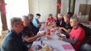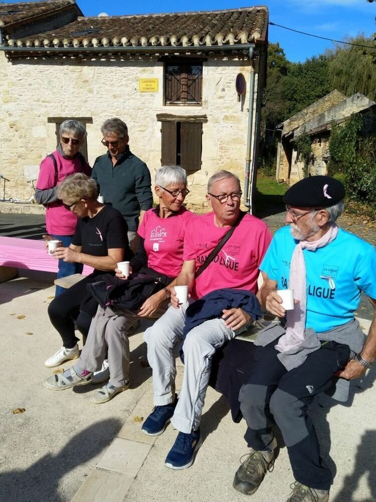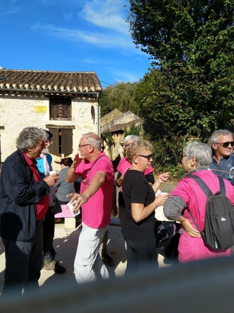 Nous sommes accueillis sur la place du village par la bandas " Los Tri Olé ! " de Puy l’Évêque, autour d’un apéritif, avec les discours traditionnels…avant un repas sous la halle. Un peu déçus de ne pas avoir gagné le jambon de la tombola, nous sommes heureux d’avoir pu participer à une animation pouvant apporter un peu de soutien à la Ligue contre le cancer du sein.