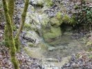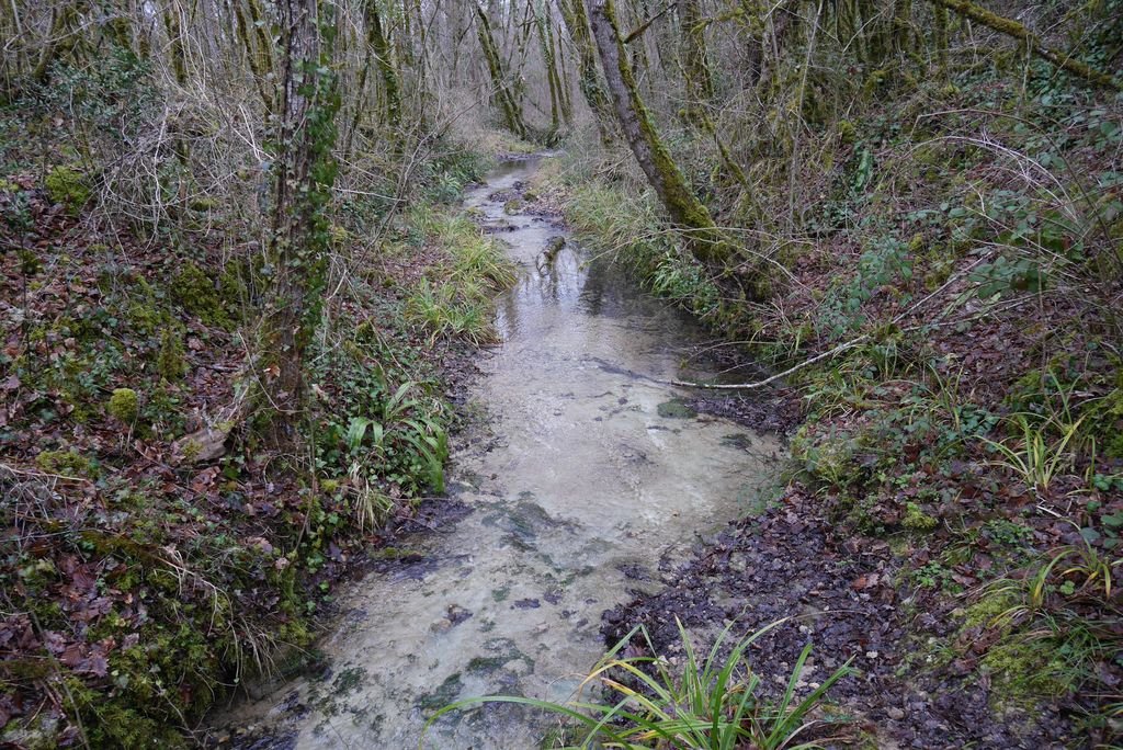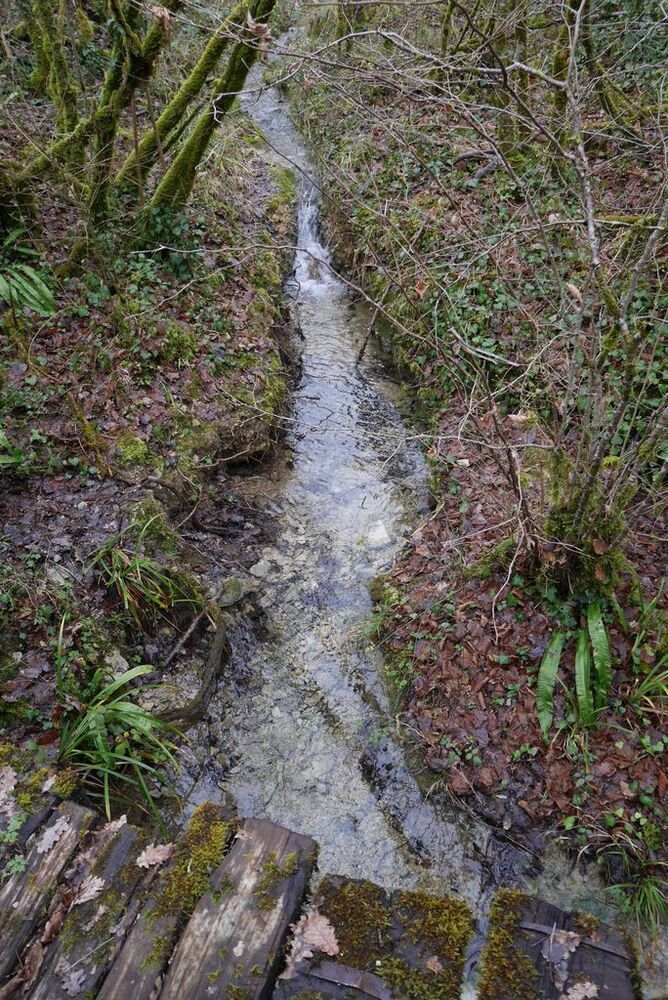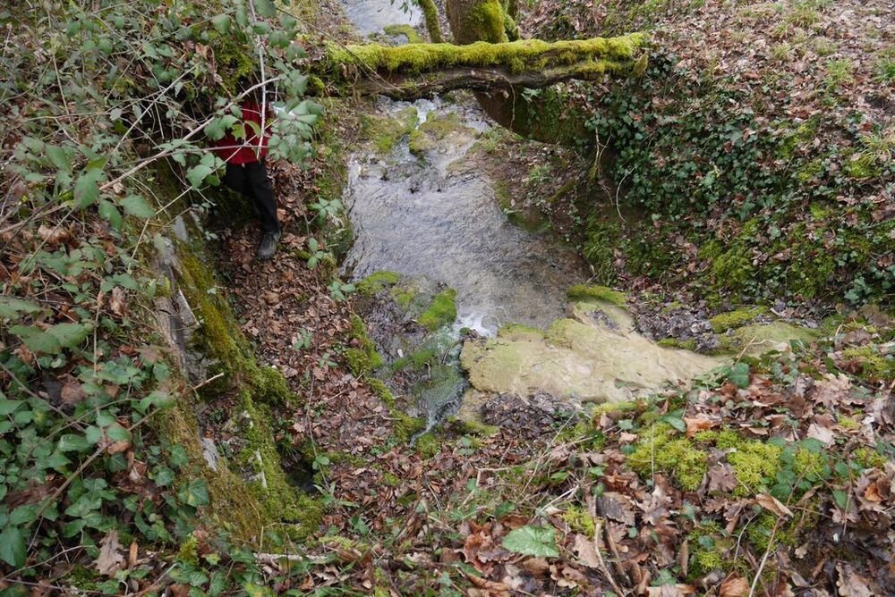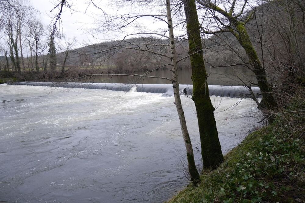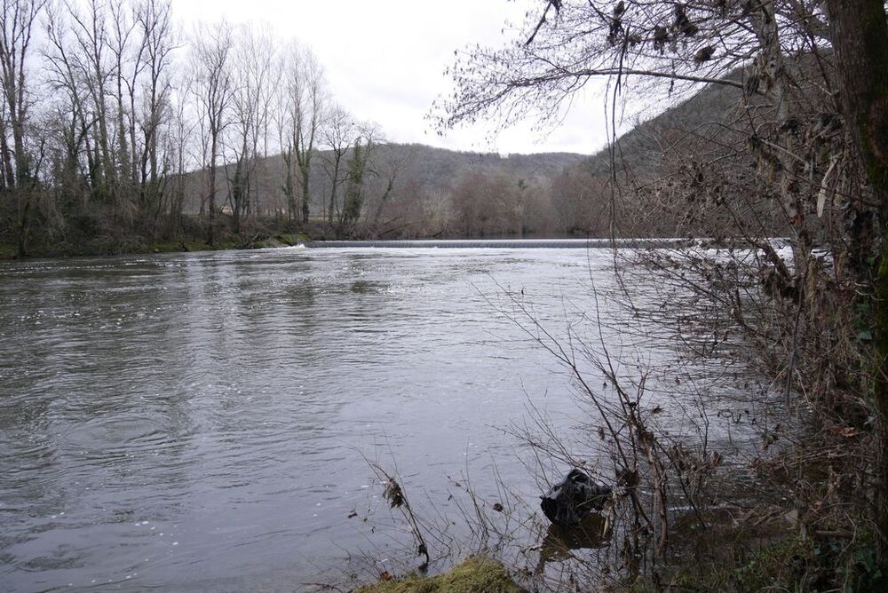 Délaissant les instruments de torture de ce parcours, nous descendons le long du Lot, longeant le barrage et ses eaux tumultueuses, puis nous traversons sur une passerelle le ruisseau de Pesquié en remarquant une fontaine dissimulée sous la roche, bâtie et voutée, aux eaux limpides.