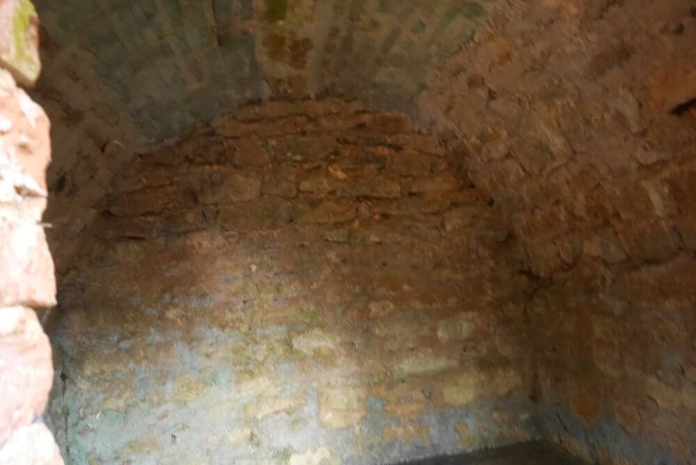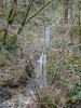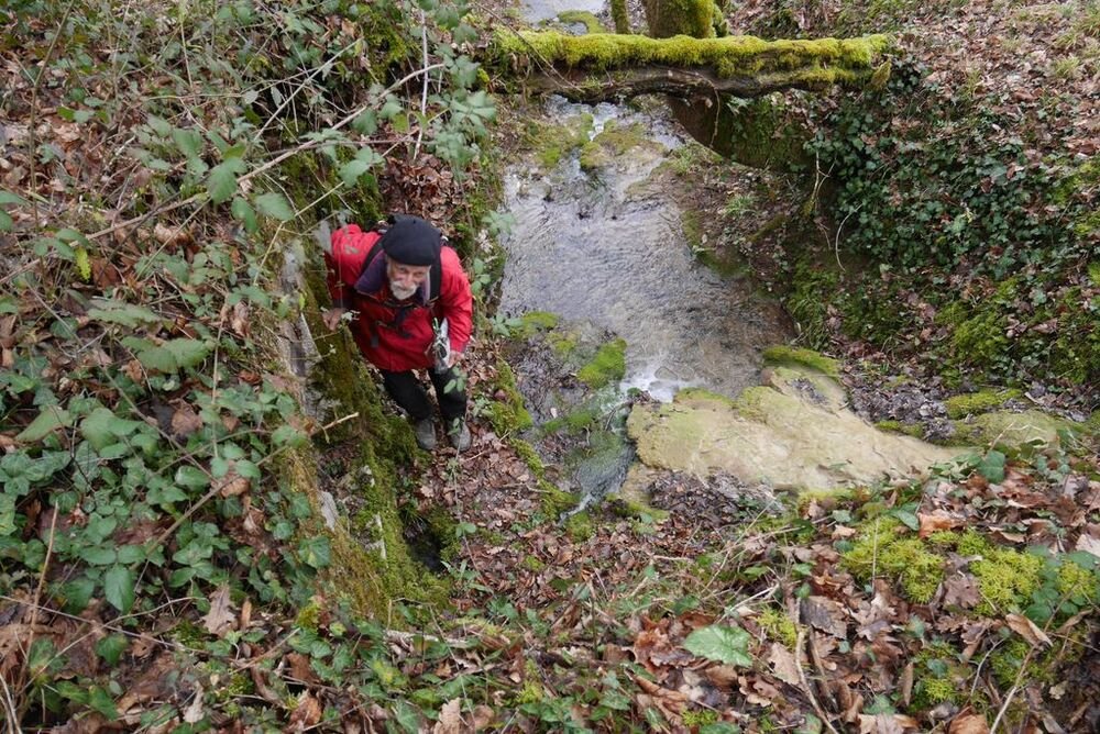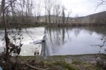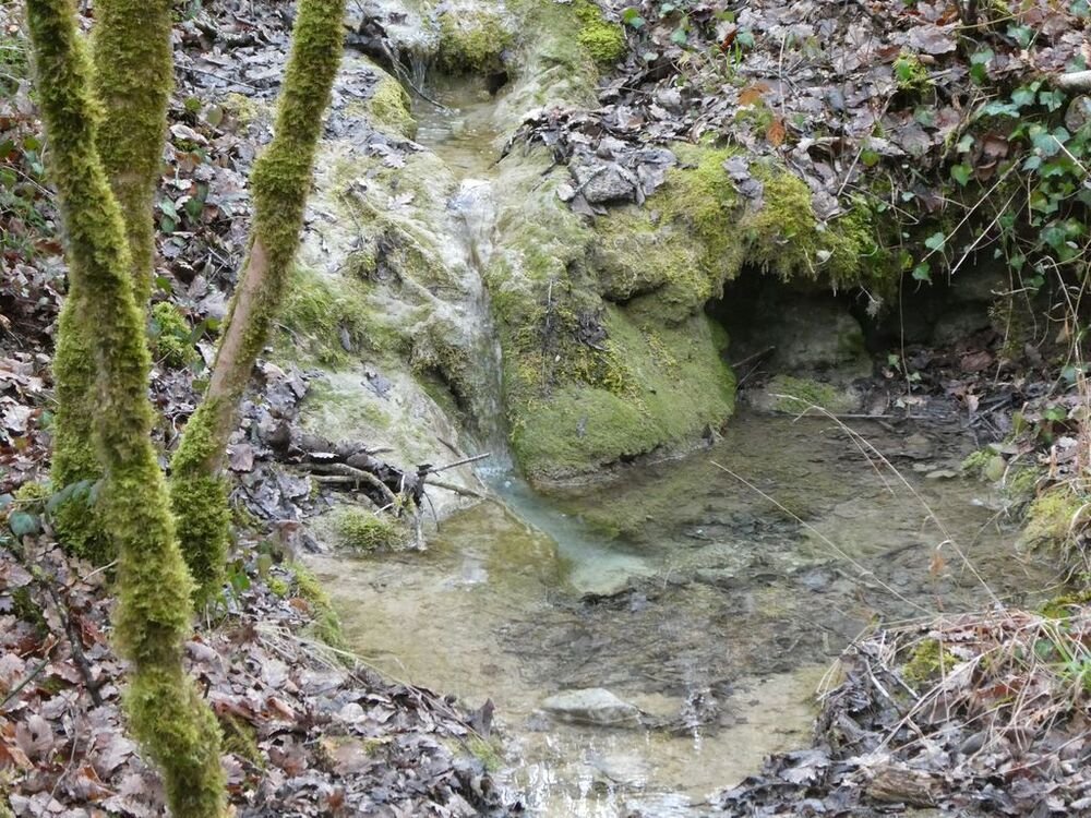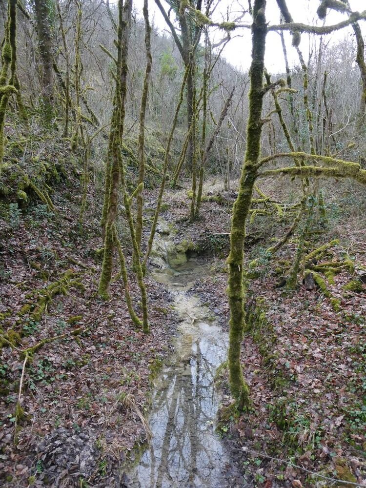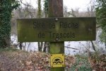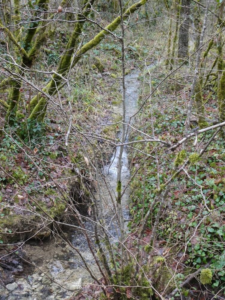 Délaissant les instruments de torture de ce parcours, nous descendons le long du Lot, longeant le barrage et ses eaux tumultueuses, puis nous traversons sur une passerelle le ruisseau de Pesquié en remarquant une fontaine dissimulée sous la roche, bâtie et voutée, aux eaux limpides.