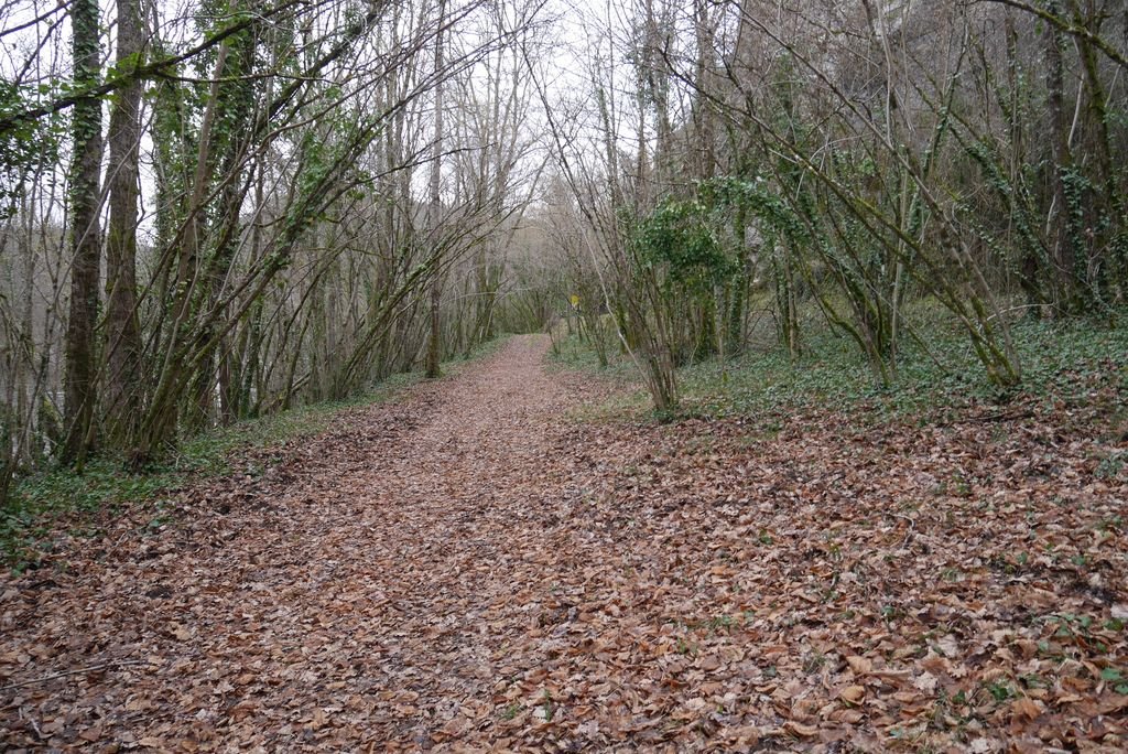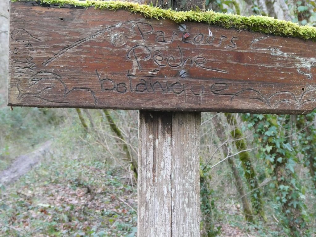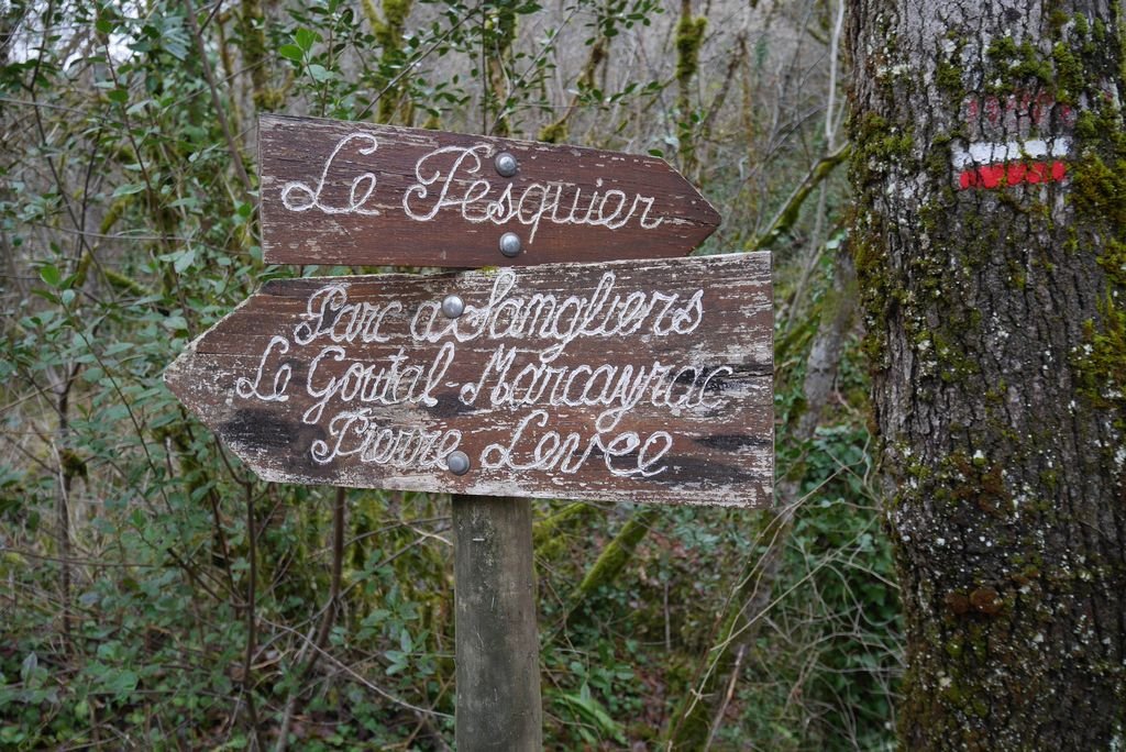 Empruntant le GR© 36 direction sud, nous remontons le cours du Lot, par un chemin enherbé, dédié d’une part à un parcours de santé et d’autre part à un sentier botanique le long de la combe de Pesquié.