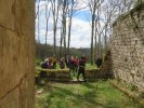 Nous empruntons le chemin de Caminade, puis le sentier Roumieu, que suivent les pèlerins de Compostelle, pour parvenir aux vestiges de l’église de Saint-Avit, que ne connaissaient pas certains d’entre-nous. C’est l’occasion pour Philippe d’apporter quelques précisions à propos de ces ruines. L’église du XIIe siècle aujourd’hui champêtre desservait autrefois un bourg. Les maisons de bois ont disparu et la végétation a proliféré, créant un environnement sauvage qui donne au lieu une ambiance singulière. L’origine de cette construction (qui remonte peut-être à la période mérovingienne au VIe siècle) est liée à une source guérisseuse qui était proche d’un carrefour important. L’eau de la source était réputée pour la guérison des maladies de peau des enfants. Les parents déposaient les vêtements de l’enfant, les laissaient pendant la nuit, et les reprenaient le lendemain. Plus tard, ils se contentèrent de jeter des pièces dans les buissons proches de l’édifice. Sur une imposte de l’arc triomphal qui repose sur des pieds droits, sont représentés 2 enfants allongés.
