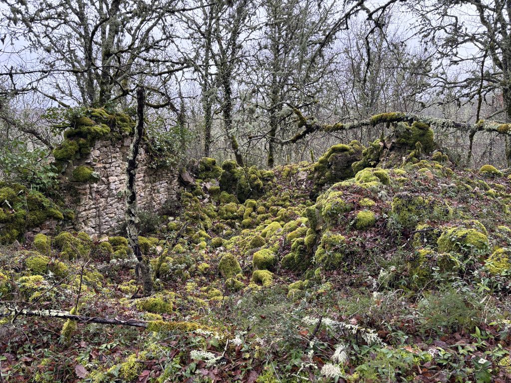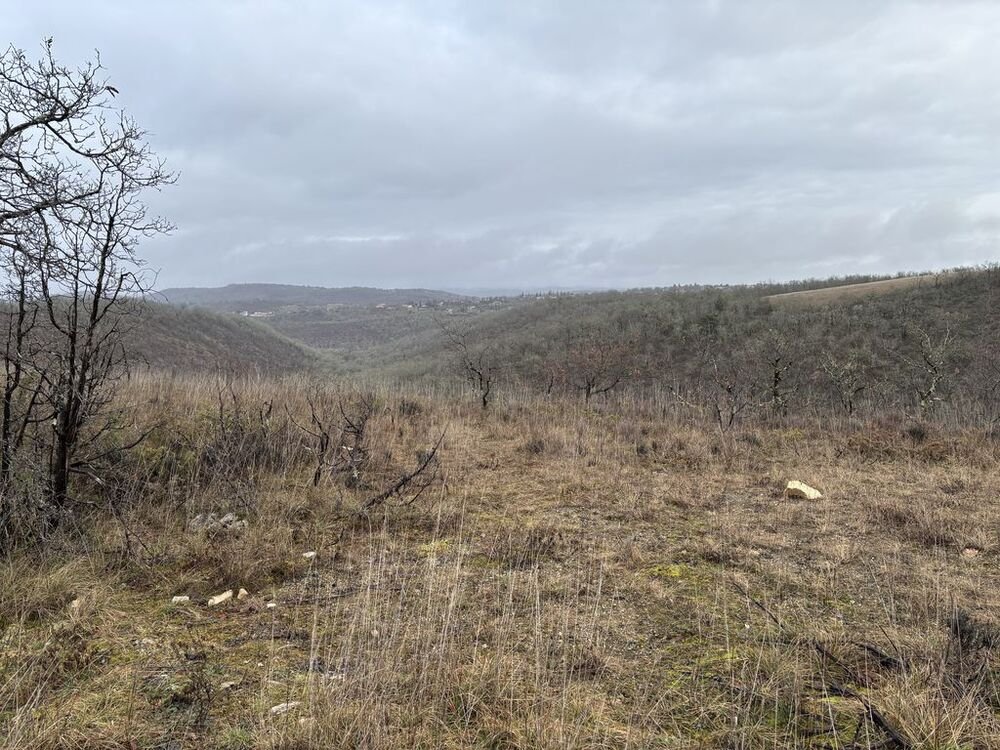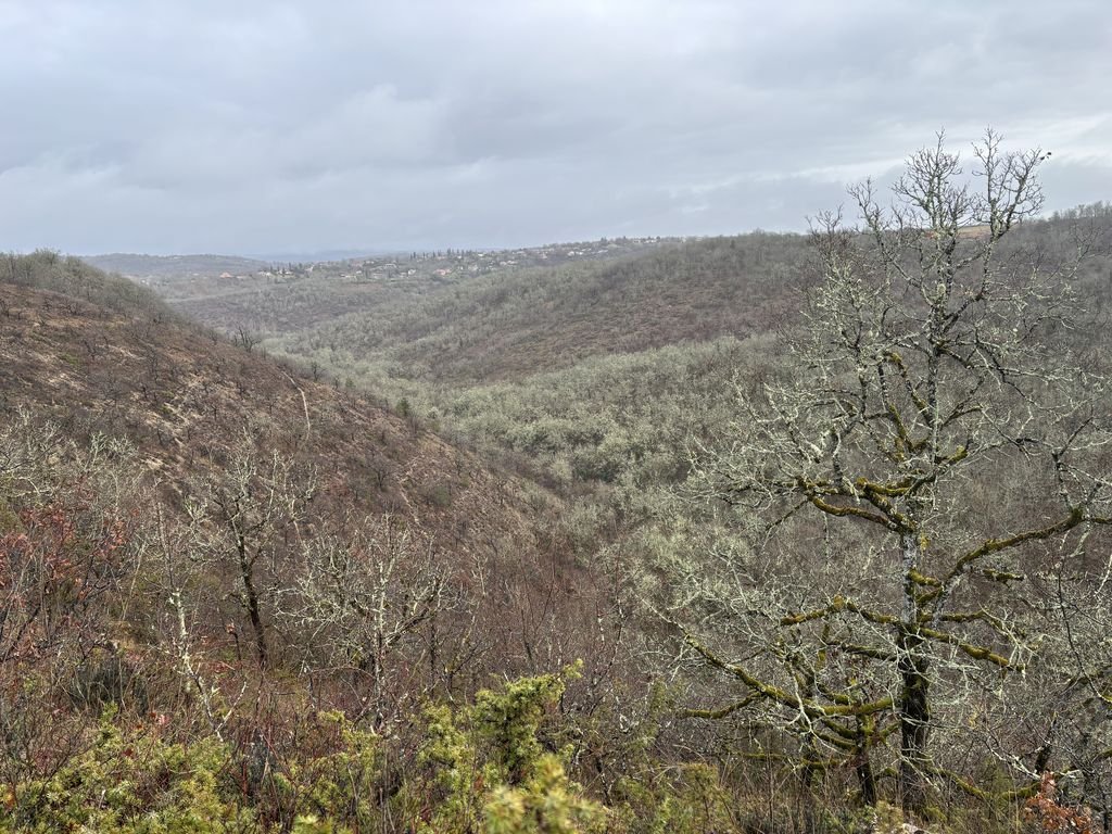 Quittant la voie verte, nous traversons le hameau de Laroque et un chemin de buis épargné par les attaques de la pyrale, nous nous dirigeons plein nord dans un paysage de causse avec ses pelouses calcaire sèches où régnait autrefois la vigne et où s’installent petit à petit champs de lavande et chênes truffiers.