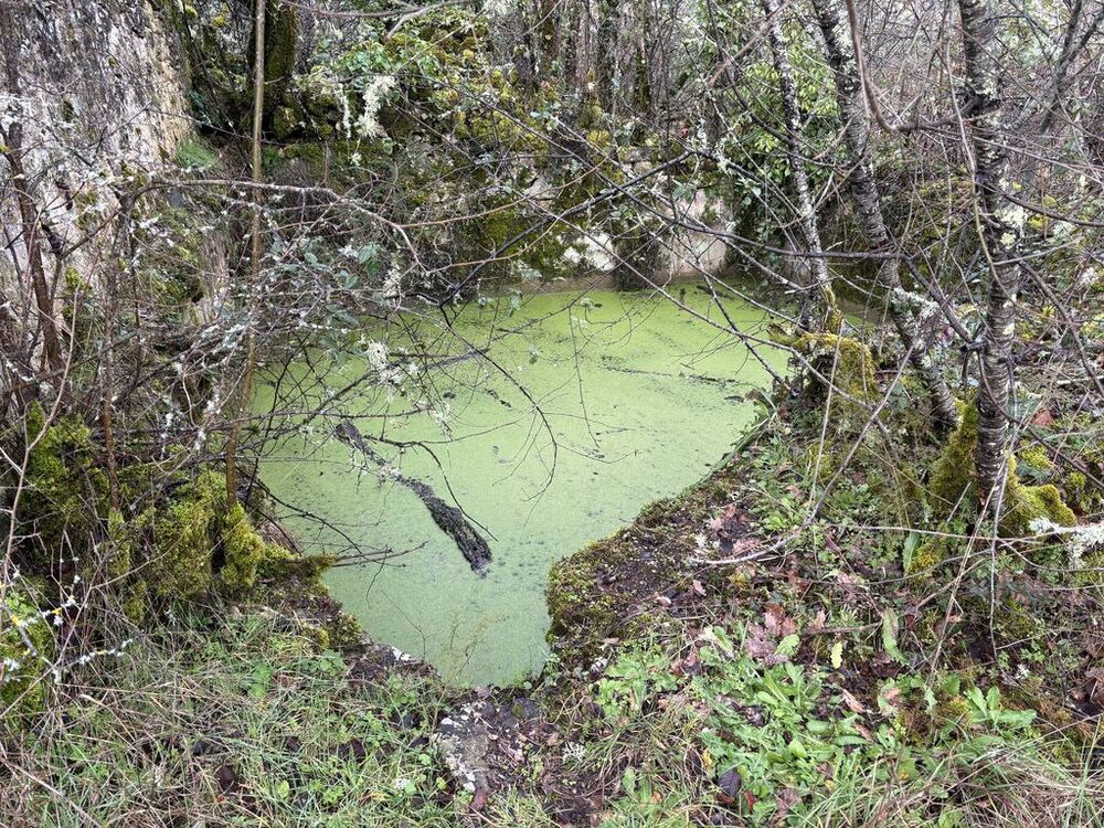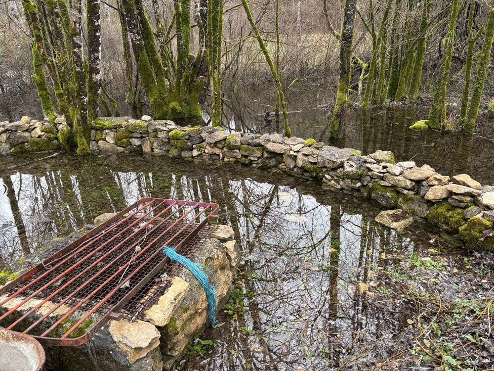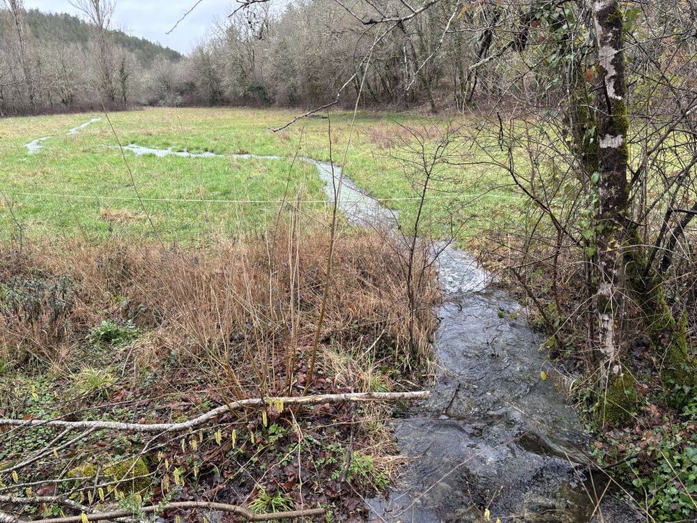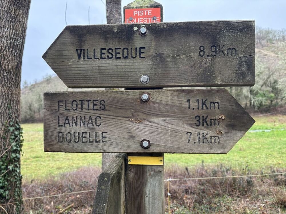 Arrivés au fond de la combe, nous longeons le ruisseau de Flottes (nom prédestiné vu les précipitations annoncées) dont les eaux cristallines divaguent dans la prairie, passons devant la station de pompage, avant de remonter vers le hameau de Lannac, découvrant un plateau aux récentes plantations de vignes.