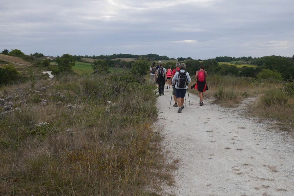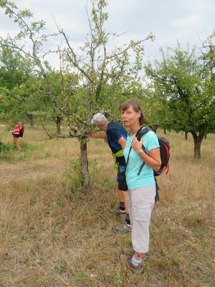 Notre groupe se met en marche pour un circuit de 13,5 kilomètres avec un dénivelé de 250 mètres environ. Nous traversons de hameau de Lapeyrière pour atteindre ensuite le haut de la crête d’où apparaît au loin la tour de Montcuq. Nous cheminons pendant un peu plus d’un kilomètre, tout en dégustant quelques prunes d’Ente oubliées après la récolte…