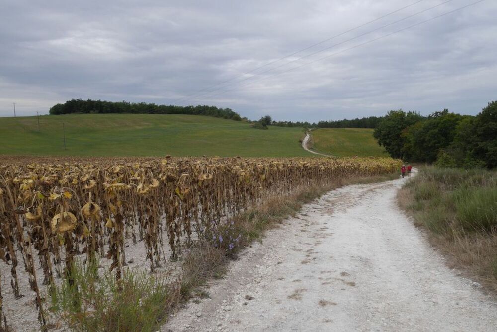 Après avoir côtoyé la Tuque de Robert, nous entamons la descente vers Saint-Pantaléon entre des champs de tournesols qui commencent à baisser la tête…