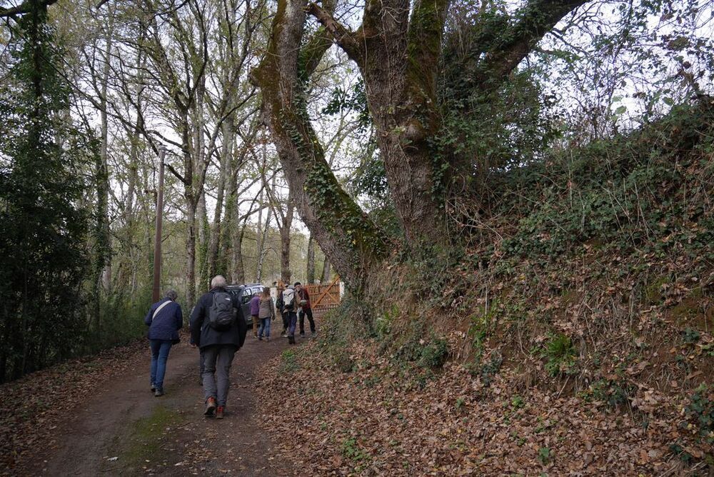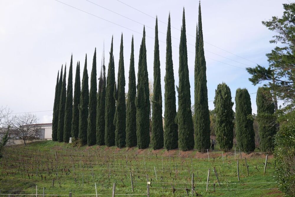 Quittant, ce hameau et le chemin de grande randonnée, nous nous enfonçons plein nord dans la chênaie vers la propriété viticole du château de Rouffiac, franchissant au passage la latitude 44 (nom d’un cru du château), caractérisée notamment par une magnifique allée de cyprès, rappelant un paysage toscan, rassurés sur le sort de notre dissidente.