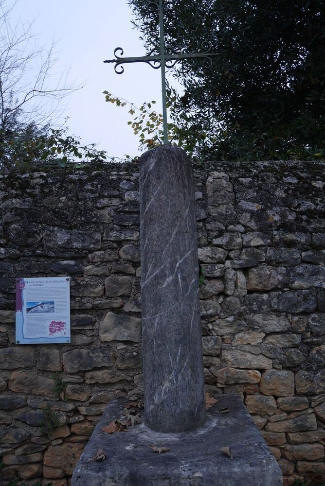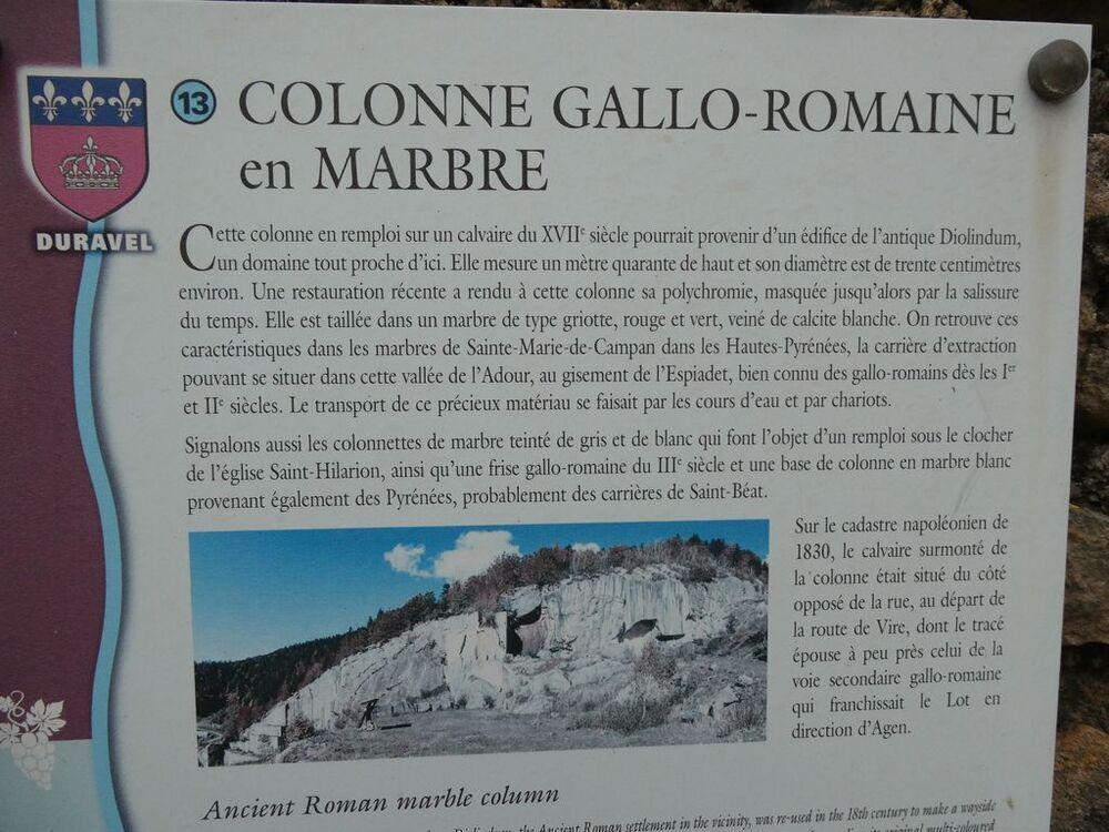 Arrivés à la D811, vers les Bouysses, nous traversons cette dernière afin de rejoindre notre point de départ après être passé devant une colonne gallo-romaine en marbre des Pyrénées réutilisée sur un calvaire, témoin inanimé du passé antique de la commune dénommée autrefois Diolindum, et qui était une importante station militaire romaine sur la voie reliant Lyon à Bordeaux (seule étape entre Cahors et Villeneuve sur Lot).