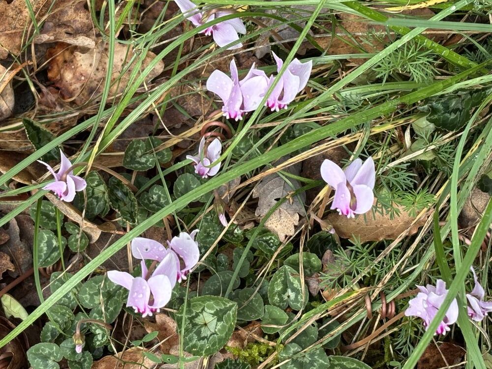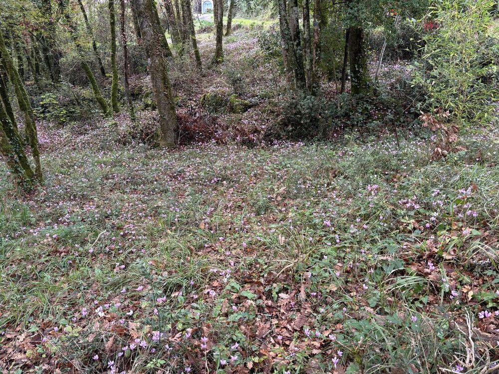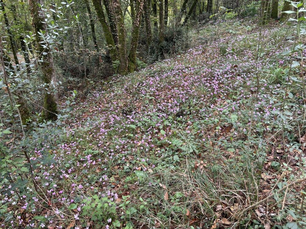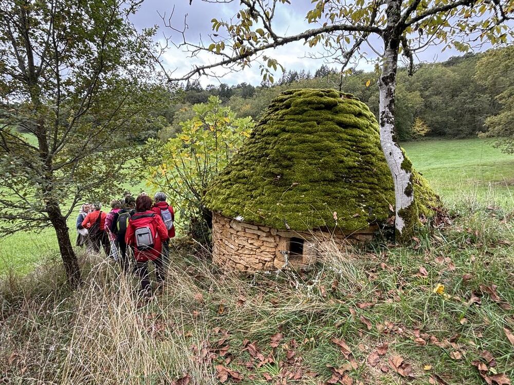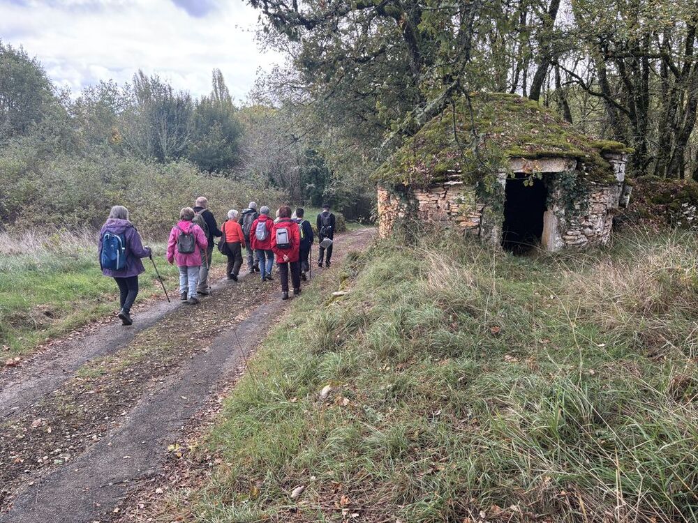 Nous partons du parking de l’église de Martignac en direction du hameau de Trébuzac que nous atteignons par un chemin boisé. En contrebas de la route, bien dissimulée dans le feuillage des arbres, nous découvrons une magnifique gariotte à la toiture moussue. Nous continuons à descendre le sentier vers Gagnabet et passons devant l’ancienne carrière creusée dans le rocher. Après avoir atteint la D28, nous gagnons un petit chemin sur la gauche qui nous évite de marcher sur le goudron. Nous arrivons ensuite à hauteur des champignonnières où nous nous arrêtons le temps d’admirer un tapis de cyclamens qui recouvre le sol.
