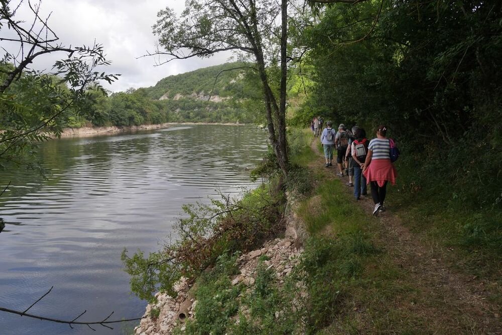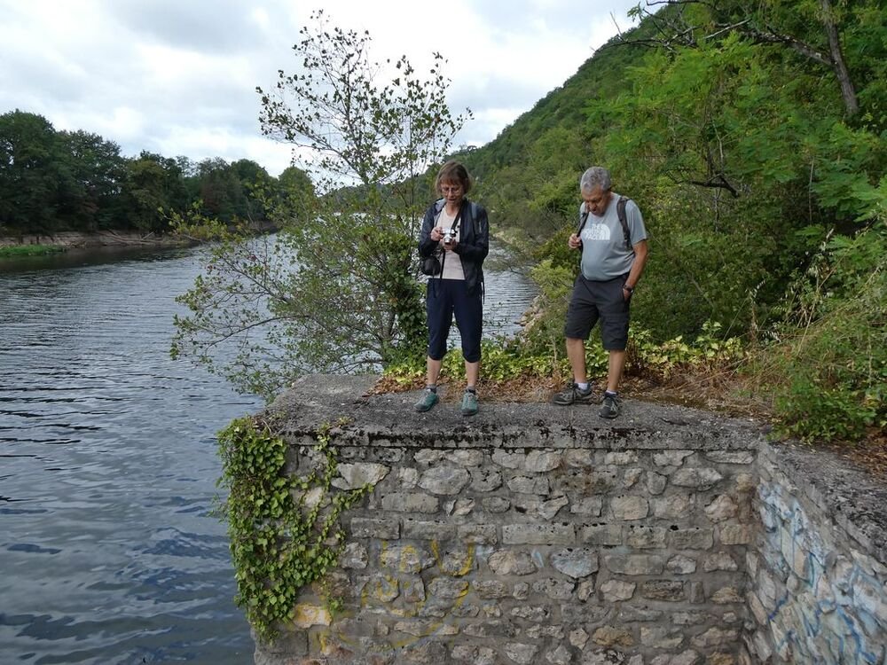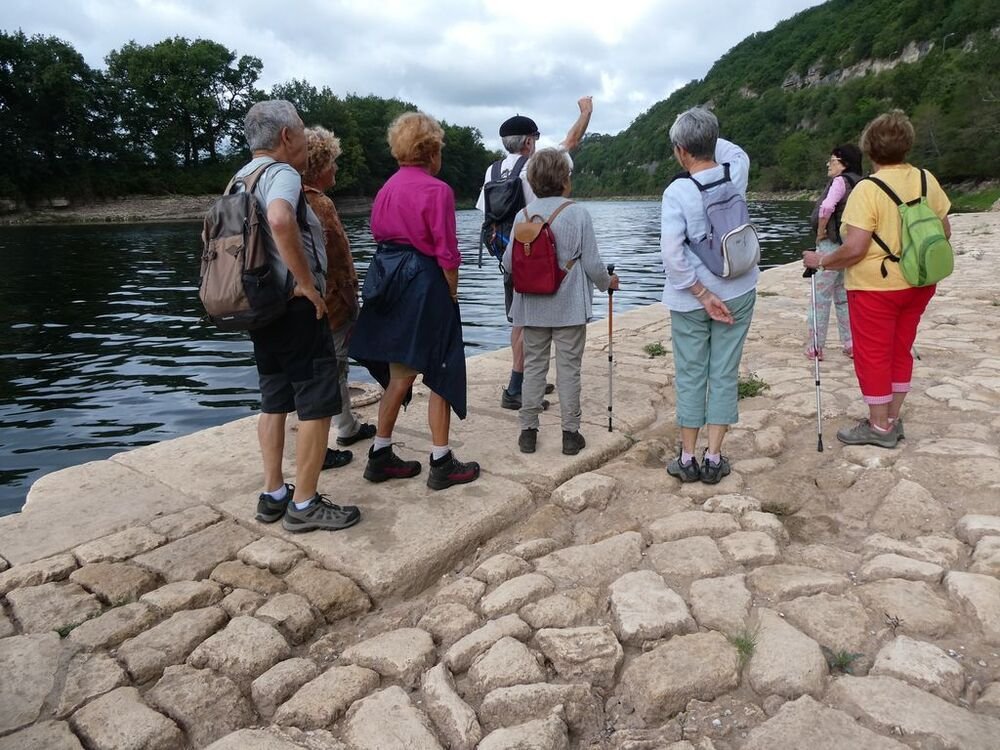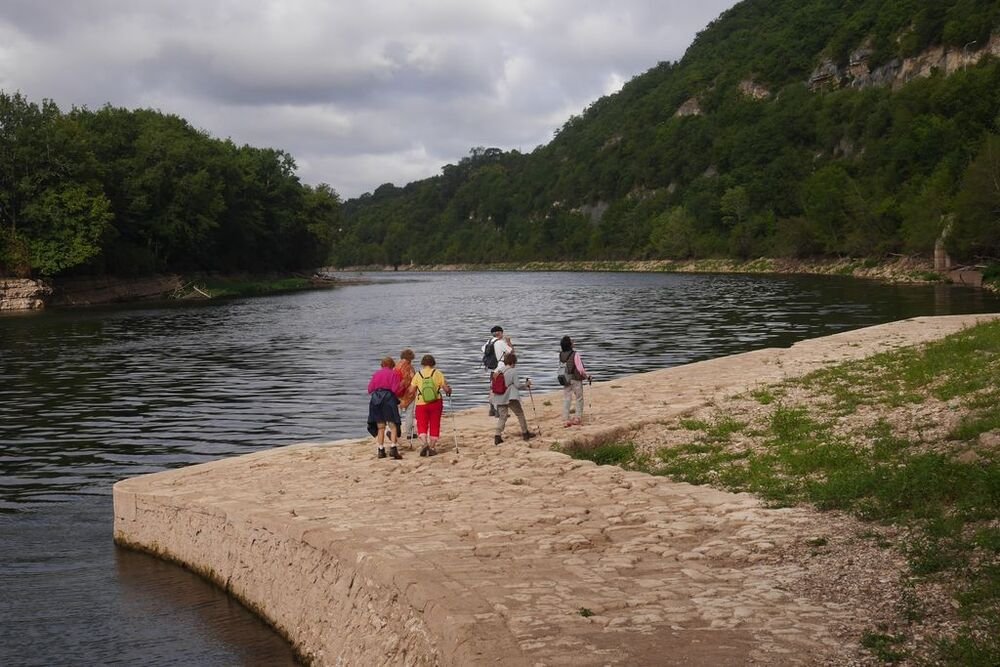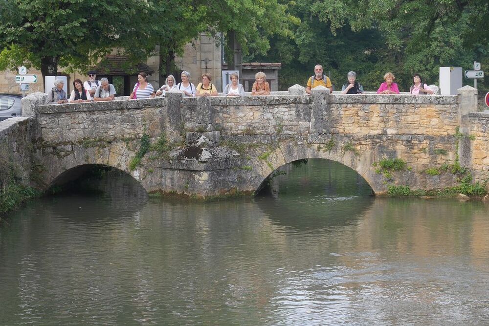 Fort de 14 unités, notre groupe se dirige plein est, sur la voie verte dénommée « Baladoir » en direction du centre bourg de Condat traversant les vieux quartiers jusqu’à la confluence (étymologie du mot Condat) sous le pont Napoléon, de la Thèze et du Lot.