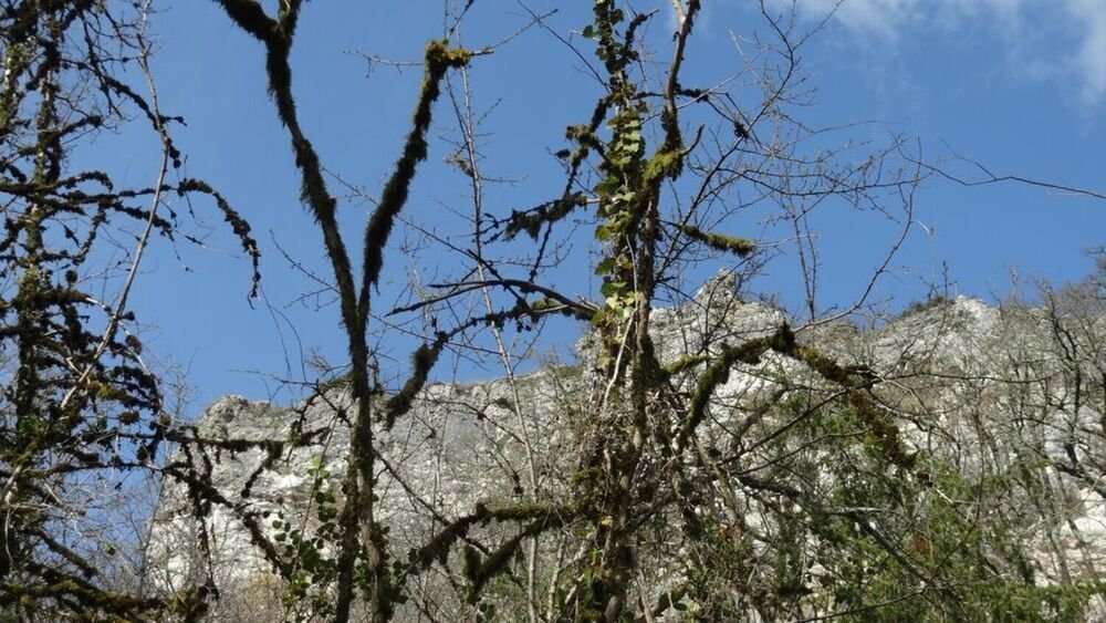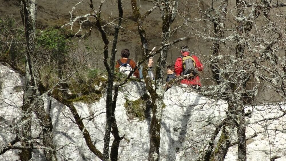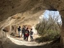 Notre parcours nous amène dans un deuxième temps vers les falaises de calcaire où se logent des abris troglodytiques. Nous quittons le sentier pour aller découvrir ce lieu insolite, où nos camarades de randonnée s’en donnent à cœur joie : certains profitent du banc improbable installé sous les voûtes pour une pause bien méritée après les efforts accomplis pour parvenir jusque-là. Une autre s’allonge carrément sur un « canapé » dont le moelleux doit laisser à désirer. D’autres encore, bien installées côte à côte contre la paroi de l’abri, sourient délicieusement à l’objectif qui les guette . . . Et toutes et tous n’ont d’yeux que pour les peintures rupestres dont la datation n’a rien de « préhistorique » ! . . . Et notre guide, inlassablement, veille au grain afin que nulle « brebis », emportée par l’ivresse des hauteurs, ne fasse un pas malencontreux dans le vide. . . La fin de l’épisode sera animée par l’exploit de notre championne préférée, qui n’a pas démérité en s’accrochant aux basques d’un des nôtres pour accomplir une descente périlleuse vers le sentier. Les randos douces nous réservent des moments inattendus qui valent leur pesant d’or !