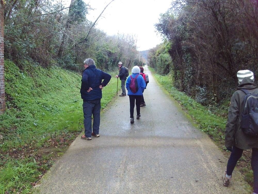 Quittant la voie verte, nous prenons, plein sud, un chemin asphalté, en direction du hameau de la Rive, qui se transforme en chemin herbeux et boueux à proximité des vignes du domaine de la Gineste.