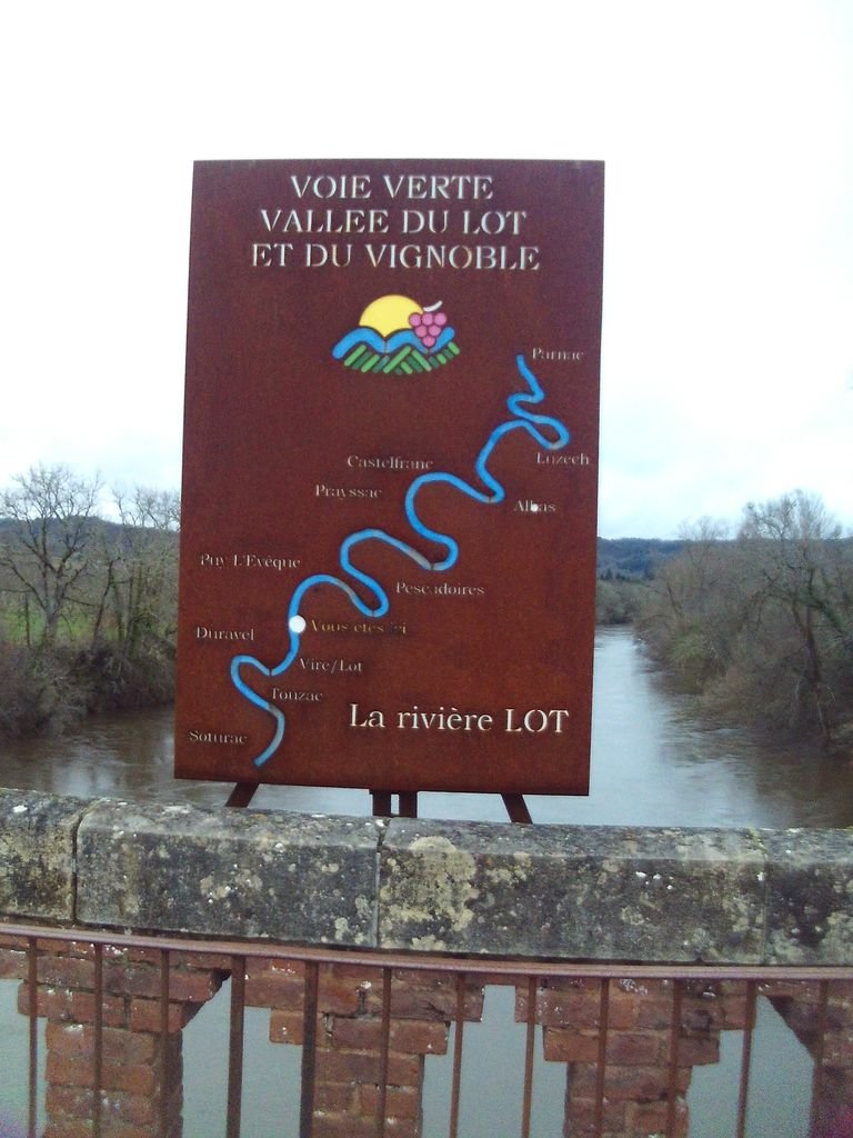 Nous traversons ensuite la départementale 8, regagnons la voie verte à proximité immédiate des vignes du Domaine de Crozes de Pys, franchissons le Lot sur l’ancien pont ferroviaire de Lacroze et arpentons cette voie jusqu’ à l’ancienne gare de Duravel.