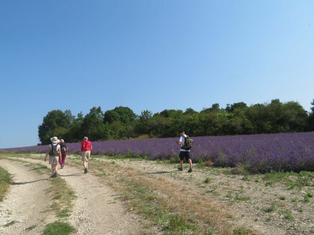 Nous repartons sur un chemin qui surplombe le château de Latour. Visiblement ce chemin public a dû faire l’objet d’une tentative de privatisation par les propriétaires du Chateau puisque nous passons entre les vestiges de deux portails. Le chemin monte et nous atteignons un champ de lavande non encore moissonné qui répand son doux parfum tout en nous offrant un véritable tableau, le parme, le vert et le bleu du ciel : Paul Cézanne n’a pas pu ne pas venir croquer ces superbes étendues. Béatrice, en apicultrice avérée, avertit nos randonneurs de faire très attention aux abeilles car les apiculteurs sont en train de récupérer le miel des ruches installées en lisière des rangées : très ingénieux de pouvoir faire la collecte du miel sur le lieu de la récolte. Le parcours nous conduit par une descente au très joli village de Couvignac. Accueillis par quelques aboiements de chien, nous repérons notre sente de retour. Ce très joli sentier dans les bois nous permet de savourer la fraîcheur et de retrouver le chemin balisé de retour à Montcuq. Nous montons et soudain nous découvrons un point de vue « digne de carte postale » sur le village de Montcuq. Photo oblige.