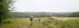 Au croisement et en face nous prenons la petite route bordée de fougères qui débouche sur un beau panorama de collines d’où émergent au loin quelques châtaigniers en fleur.