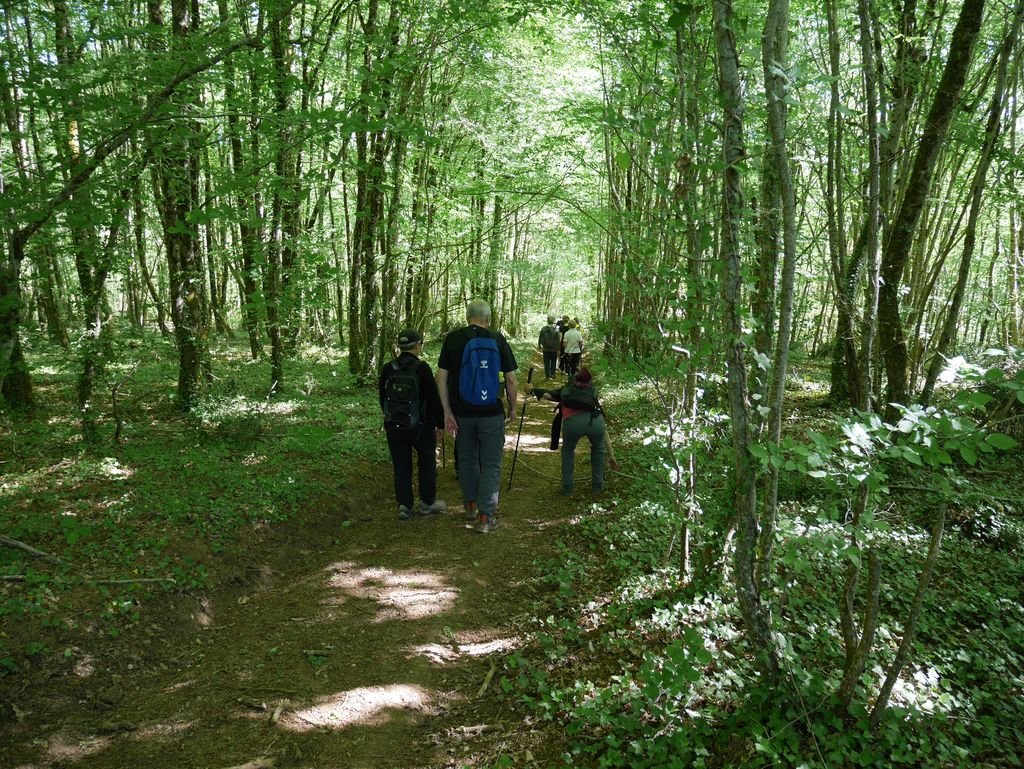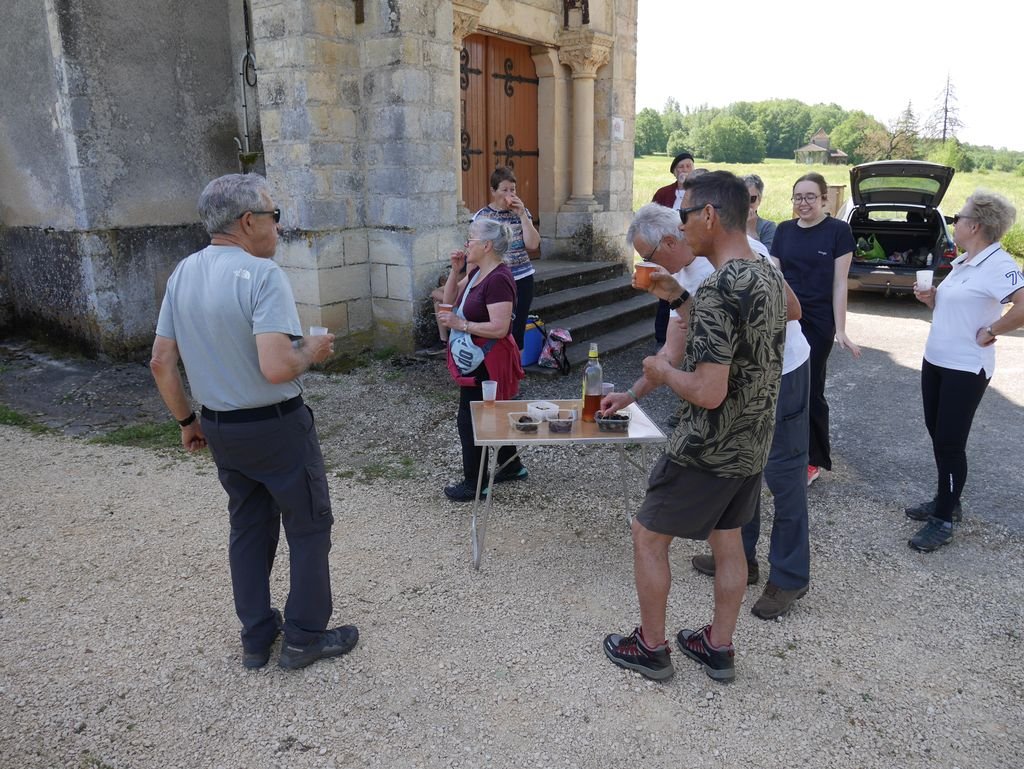 Au final une belle randonnée qui nous a fait parcourir 11km pour un dénivelé de 235m. Avant de nous séparer, notre guide a tenu à célébrer dignement sa fête en nous offrant le verre de l’amitié, accompagné de spécialités locales comme savent si bien les préparer les chasseurs de sangliers lotois. Merci à lui !
