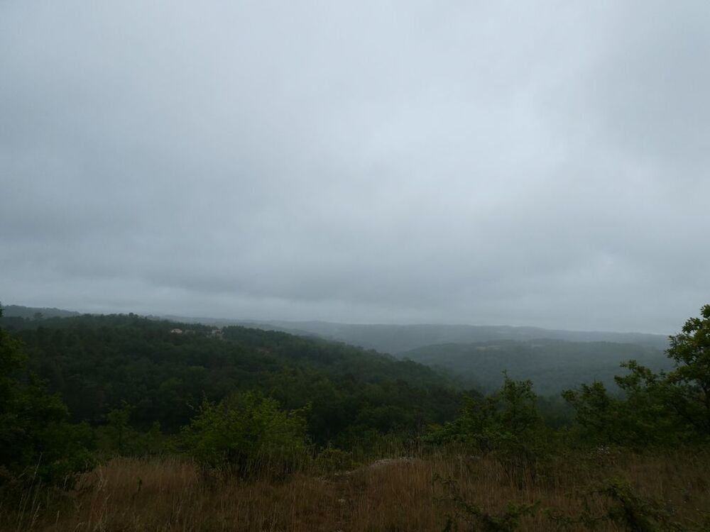 Poursuivis par une fine pluie, nous dépassons le lieu-dit « Roquebaudy », arrivons au confluent du ruisseau de Baudenque et du Lissourgues, traversons la D 45 et entreprenons la montée vers le hameau de Lalaurie.