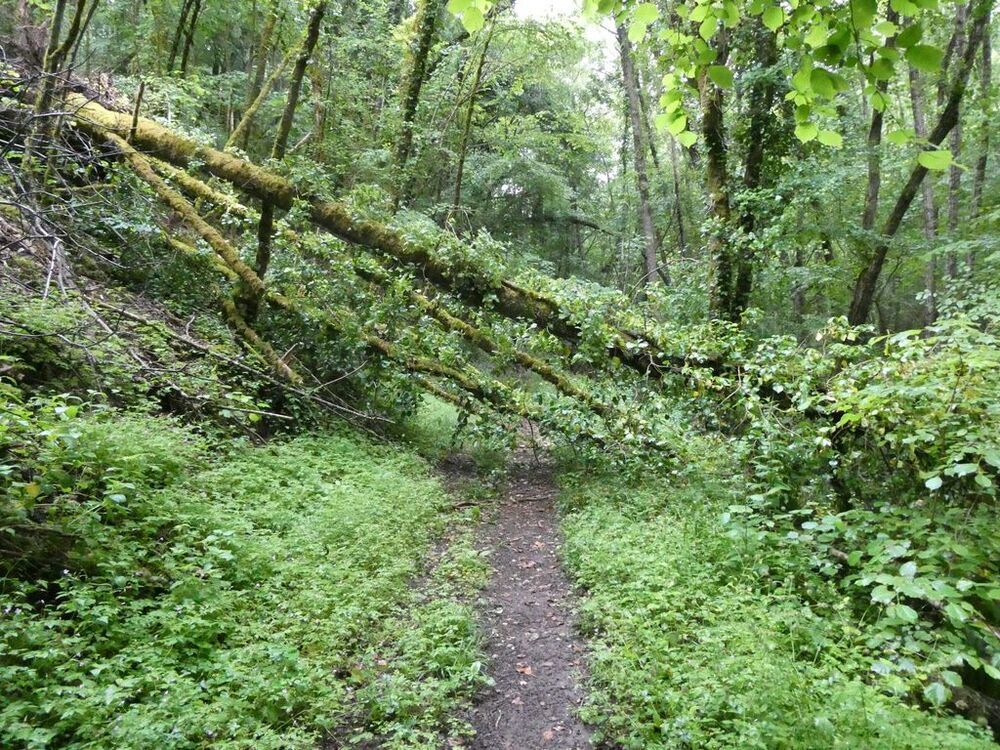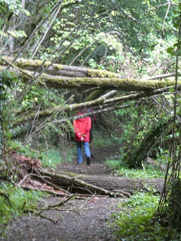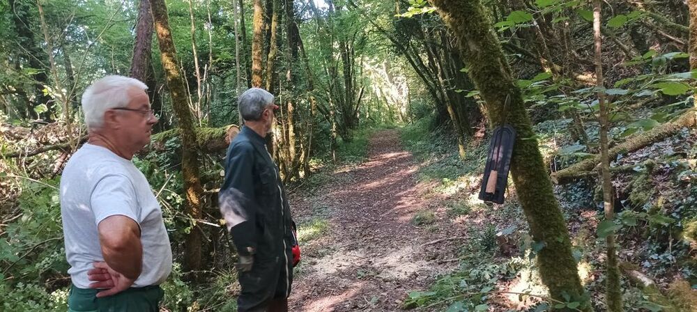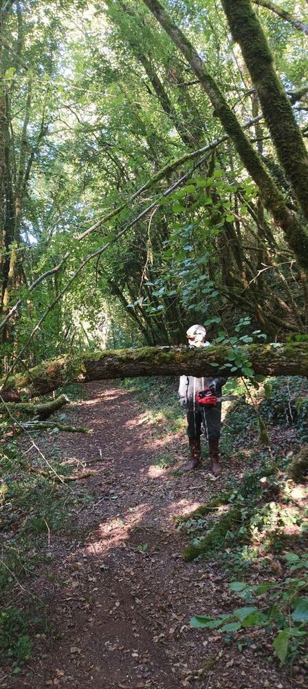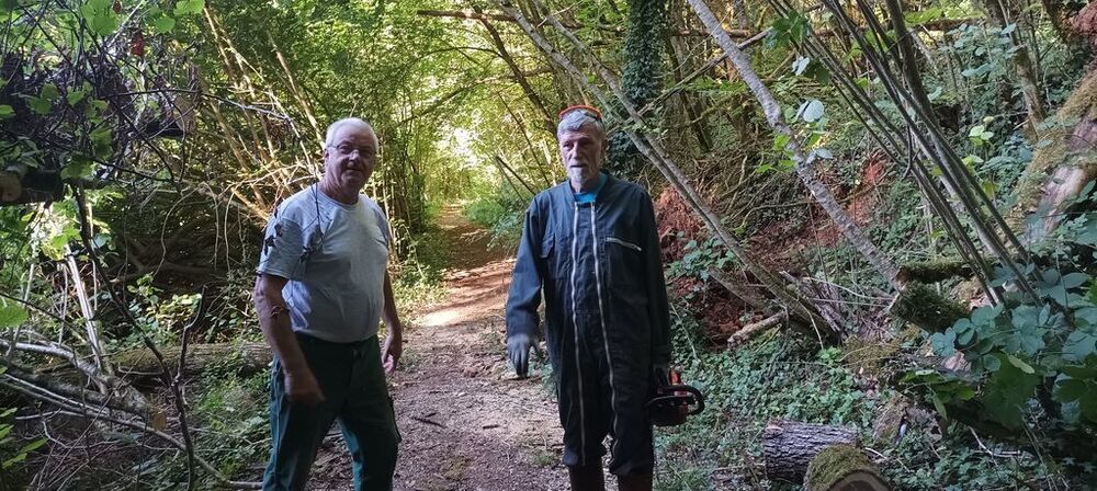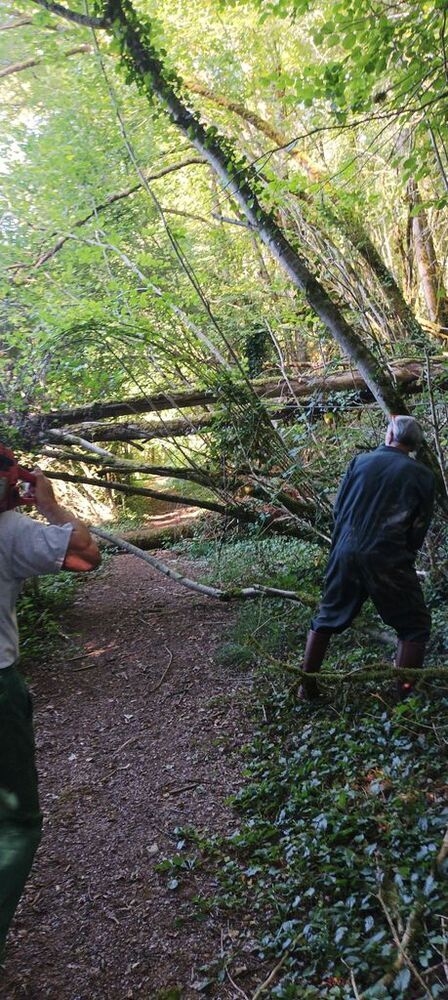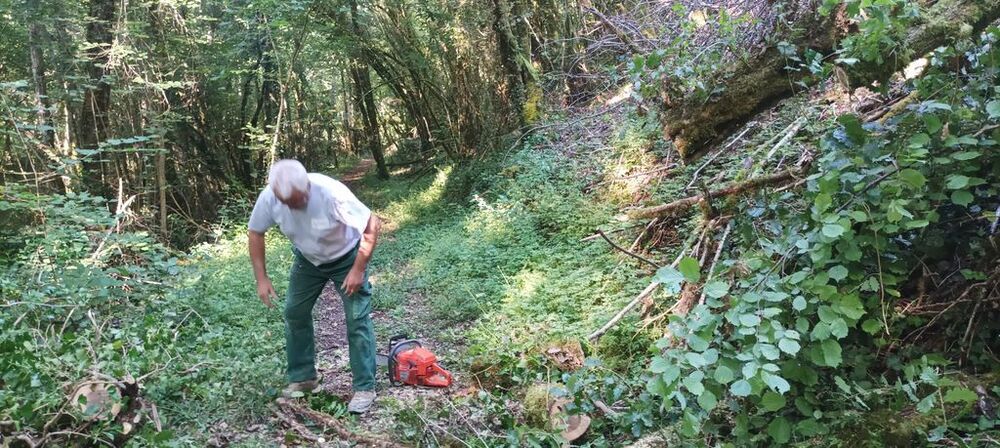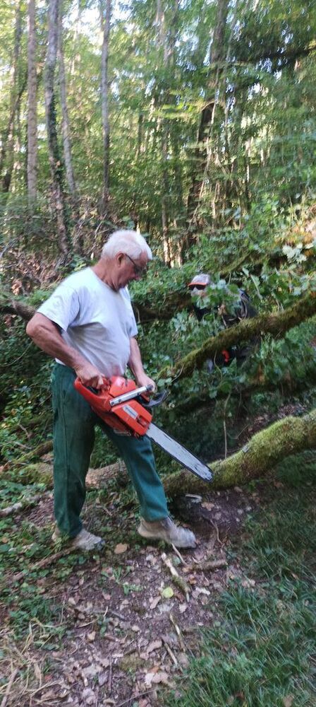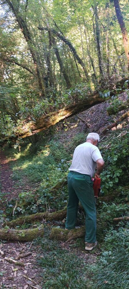 Lourdement armé d’une grosse tronçonneuse, Georges, notre chef d’équipe, maniant avec dextérité le gros engin, s’est chargé de libérer le chemin, tandis que Hubert et Philippe, ses arpètes, déposaient les billots de bois de part et d’autre du sentier ou coupaient avec une élagueuses les petites branches.