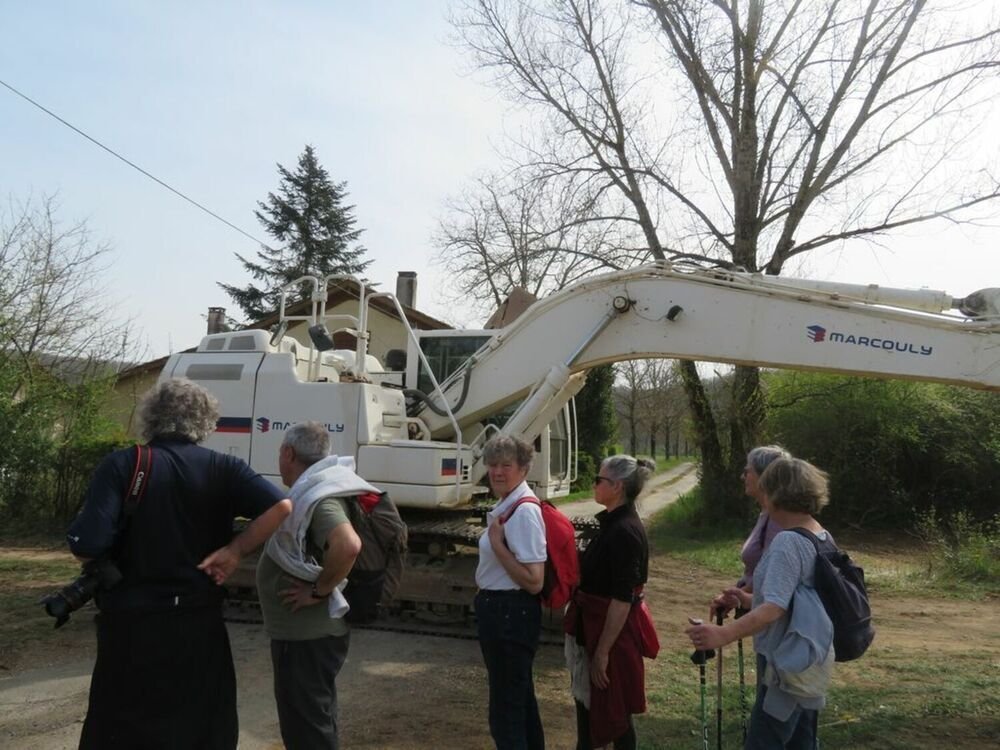 Nous reprenons notre marche pour bientôt nous retrouver auprès de gros engins travaillant au prolongement de la Voie Verte qui rejoindra celle déjà achevée du côté du pont de Touzac. On nous libère le passage, et un peu plus loin nous empruntons la piste dégagée par les engins : nous « inaugurons » en quelque sorte ce tronçon, dont les travaux sont encore loin d’être achevés.