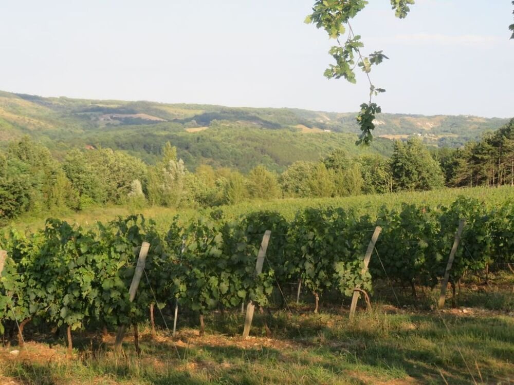 Depuis l’église, nous prenons la direction du Pech Carlat. Nous laissons le moulin sur notre droite pour descendre vers Ségos le long d’un sentier ombragé. Belle vue sur le Château Chambert et les collines alentour, éclairées par une chaude lumière dorée. Au pied du pech, nous prenons à droite, vers les terres rouges de la cuirasse ferralitique de Floressas, découverte tout dernièrement lors d’une randonnée nature en compagnie de Michel Calvino, président du Cercle Quercinois des Sciences de la Terre. Nous quittons un instant le chemin pour faire une incursion sur cette terre dont l’ocre rouge foncé est ponctué par le vert vif de la végétation, offrant au promeneur occasionnel un décor inattendu ! Nous revenons sur nos pas pour retrouver le chemin et remonter vers le plateau, laissant Sérignac sur notre gauche pour rejoindre le lieu-dit La Fuye, à partir duquel nous cheminerons parmi les vignes.