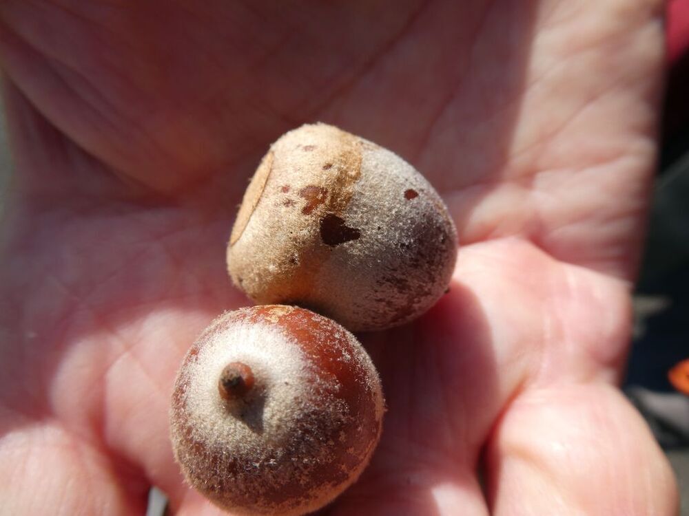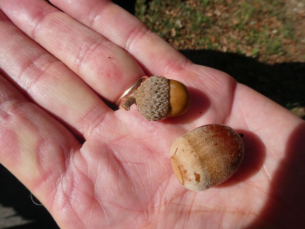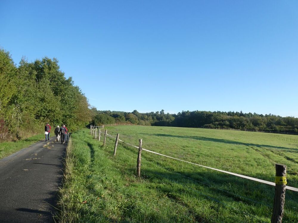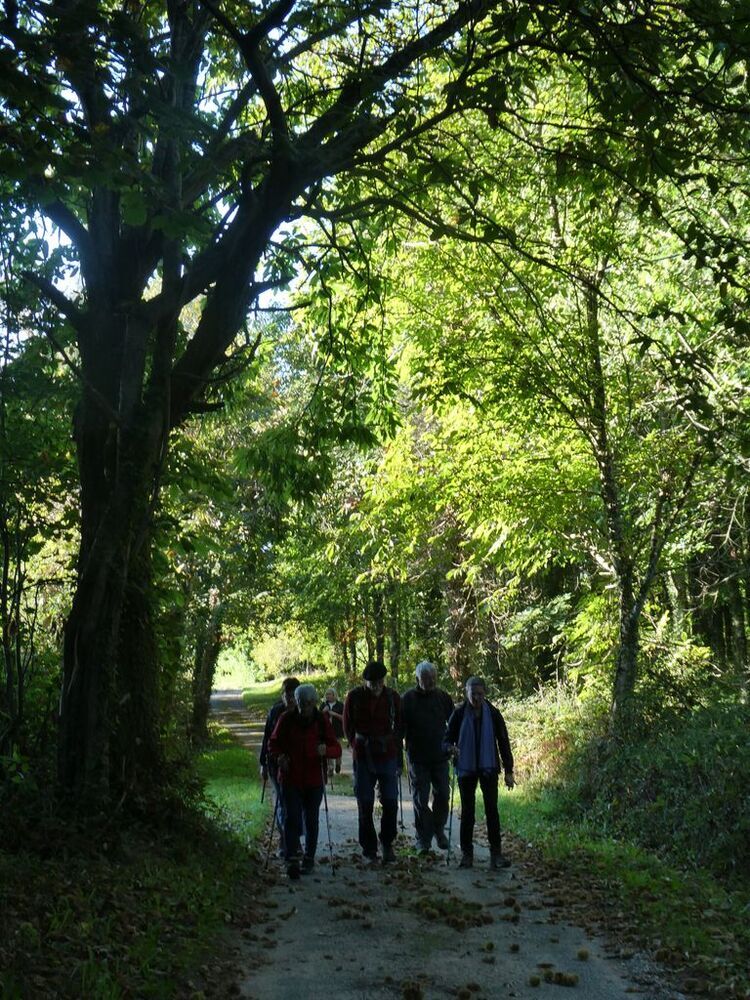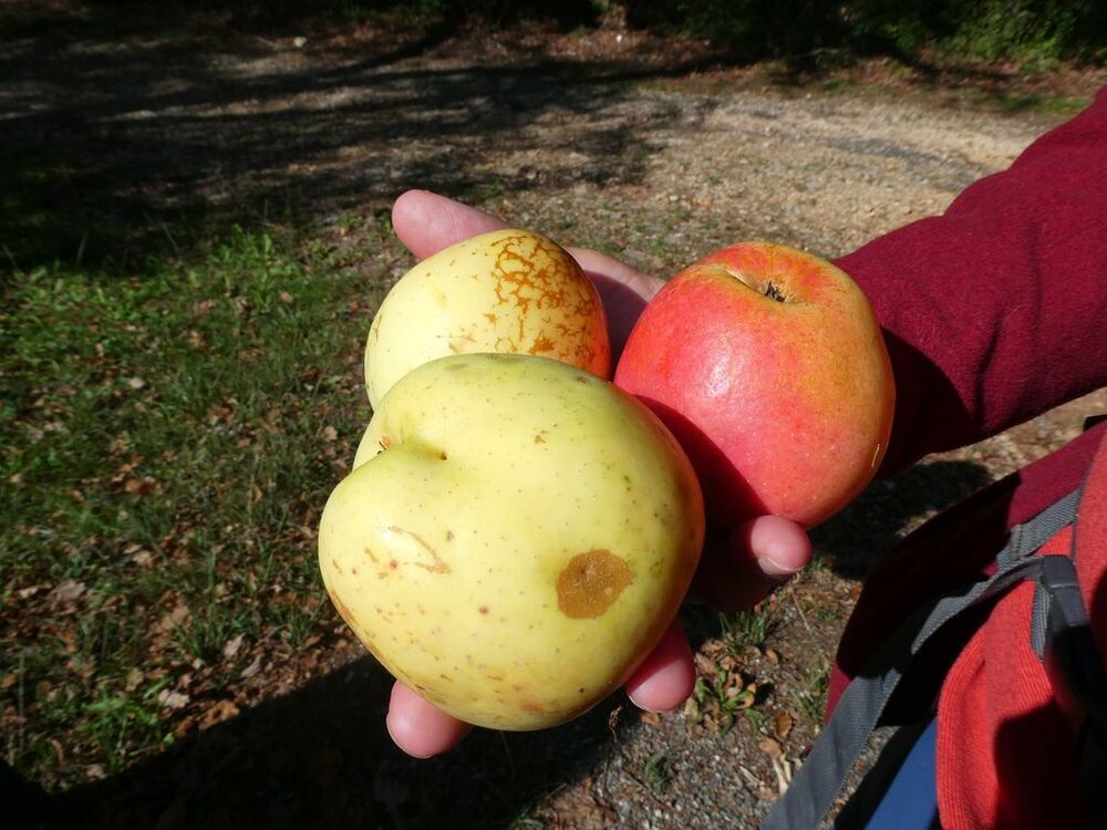 Depuis l’église, nous sommes 10 à emprunter la route de Pestillac jusqu’au chemin de Mayne Haute. Nous remarquons, le long de cette route, de magnifiques chênes d’Amérique, aux grandes feuilles encore bien vertes et dont le tronc sans branches basses sert de bois d’œuvre. Philippe nous fait remarquer la différence de taille des glands portés par ce grand chêne, comparée à celle du chêne modeste de nos contrées ! Nous passons ensuite tout près d’une pommeraie dont les arbres croulent sous le poids de fruits innombrables ! Glaner s’impose ! Ce sera fait sur le champ ! ! !