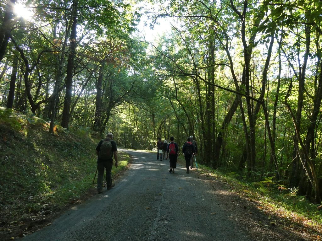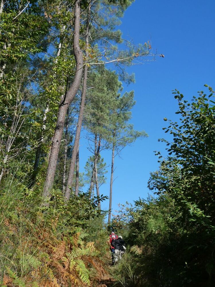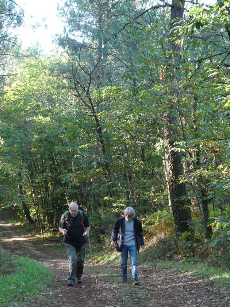 Nous poursuivons notre chemin en prenant la route des Escaliers qui nous conduit tout droit vers les Espinards où nous rencontrons notre ami Daniel en pleine récolte des châtaignes. Nous échangeons quelques mots, puis reprenons notre périple pour terminer la boucle en passant par un sentier en sous-bois dont le sol humide et l’humus odorant nous laissent penser qu’il y a certainement eu du cèpe à foison il y a quelques jours ! Nous passons trop tard !