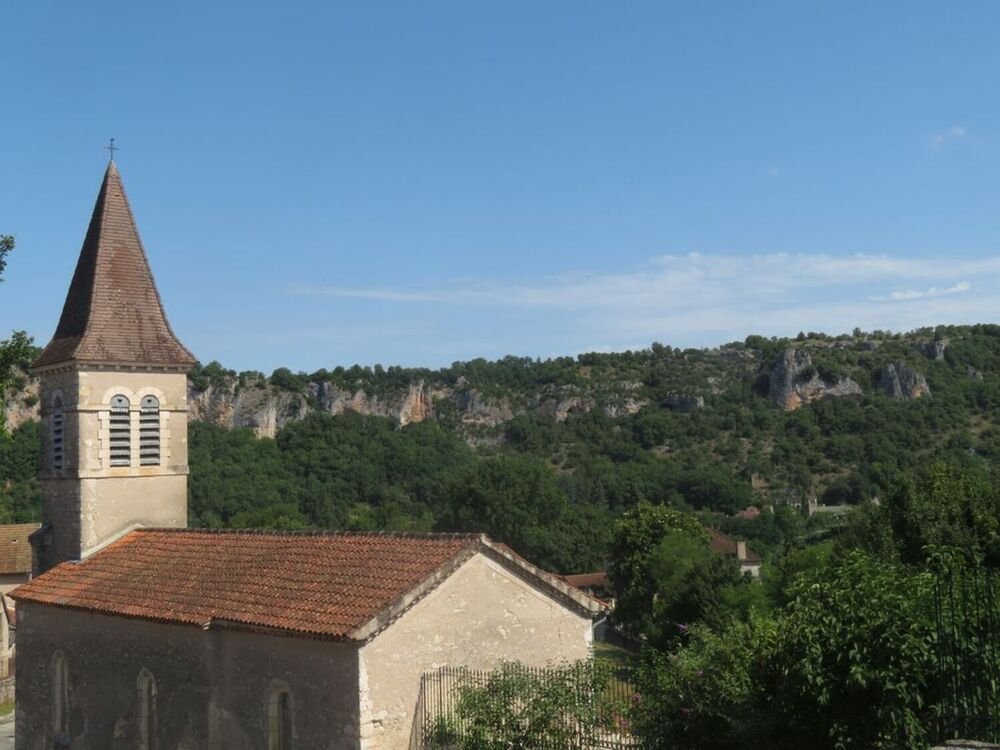Arrivés au Pech de Béars et son relais hertzien, nous descendons vers le hameau par un chemin caillouteux ménageant des vues sur la plaine cultivée côté ouest avec en point d’orgue, les falaises de Vers et au bord du Lot, l’église Notre Dame de Velles, édifiée à la fin du XIIème siècle et profondément remaniée (reconstruction complète de la façade occidentale) au XIXème siècle.