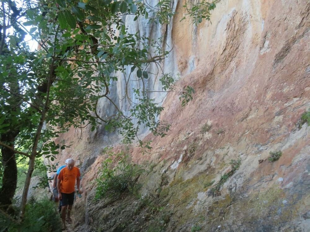 Après cet intermède, retour sur notre circuit, savoir le GR 36, puis une sente connue des seuls initiés, en contrebas de la falaise qui supportait autrefois le village gaulois de Béars, véritable oppidum, délimité, côtés ouest et est, par deux falaises dans le single du Lot et coté sud par un « murus gallicus » mur gaulois dont il ne reste que des vestiges. Protégé par ce mur forteresse, le village occupait un promontoire surplombant un méandre du Lot. Cette fortification puissante prenait la forme d’une imposante levée de terre et de pierre de 250 m de long et se prolongeait par un bourrelet de moellons fermant tout l’isthme du méandre à cet endroit.
