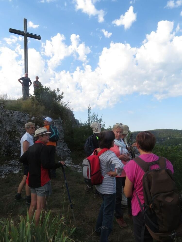 Dès le départ, nous commençons notre mise en jambe par l’ascension de la motte castrale, à la découverte du castrum de Béars édifié au milieu du IXème siècle pour surveiller le Lot, les pêcheries et les terres alentours au confluent du Lot et du Vers, dont il ne reste que des ruines, puis passage obligé à la roche anthropomorphe, à la silhouette humaine, représentant la déesse Divona, lieu sacré des druides.