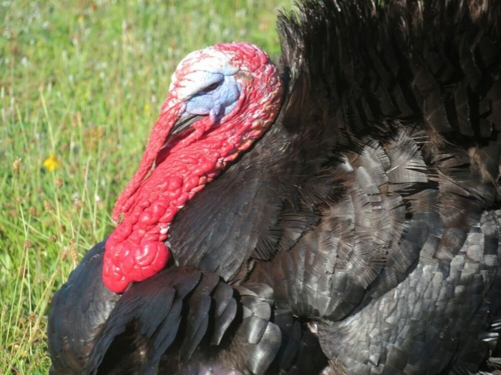 Notre parcours nous fait longer un enclos où se pavane un dindon des plus « ornementé ». Cet oiseau de la famille des gallinacés est importé d’Amérique en Europe par les Espagnols dans les années 1530. D’abord nommé « poule d’Inde », son nom devient « Dinde » par déformation. C’est un symbole de fertilité au Mexique, à cause de ses appendices charnus, les caroncules…