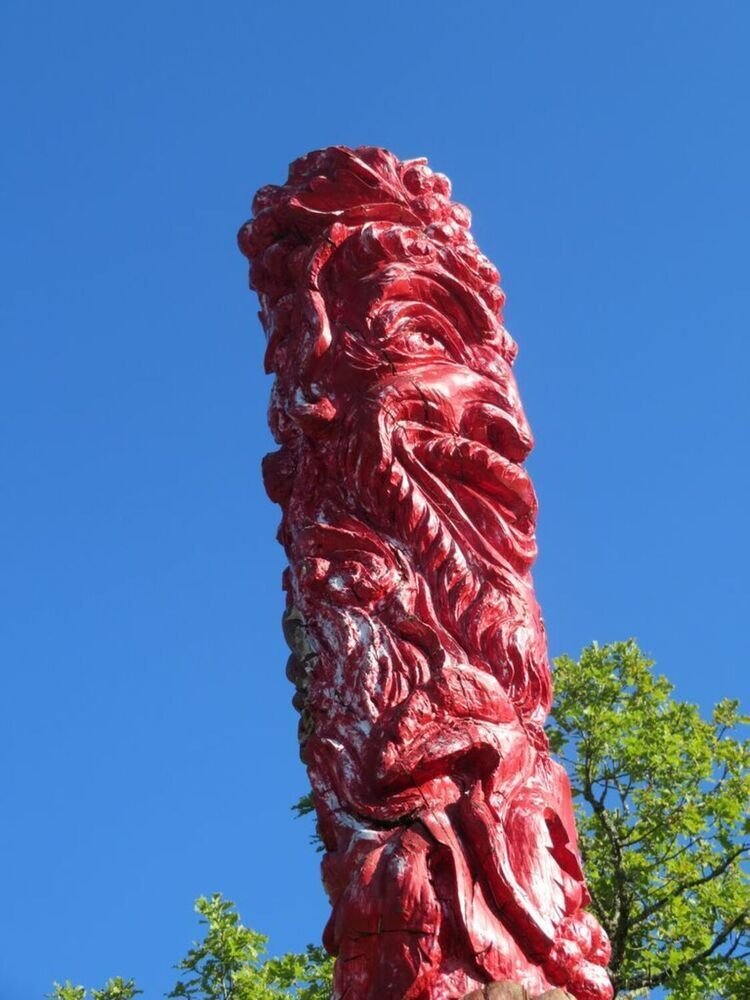 En fin de parcours nous passons devant le « Château Vent d’Autan », domaine viticole de 5,5ha en biodynamie depuis 1991. A l’entrée du domaine se dresse un majestueux totem de couleur « lie de vin » . . . Visage souriant et barbu orienté vers le levant : c’est Bacchus, ou Dionysos pour les grecs, ciselé dans le tronc d’un cèdre du Liban de six mètres de haut par le sculpteur russe Mikhaïl Alexandrov. Couronnée de grappes de raisin, parsemée de feuilles de vigne et de coquilles Saint-Jacques dorées, la sculpture symbolise les productions de la propriété et veut aussi rendre hommage aux nombreux pèlerins qui empruntent les routes du Lot et marchent vers Compostelle