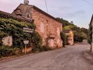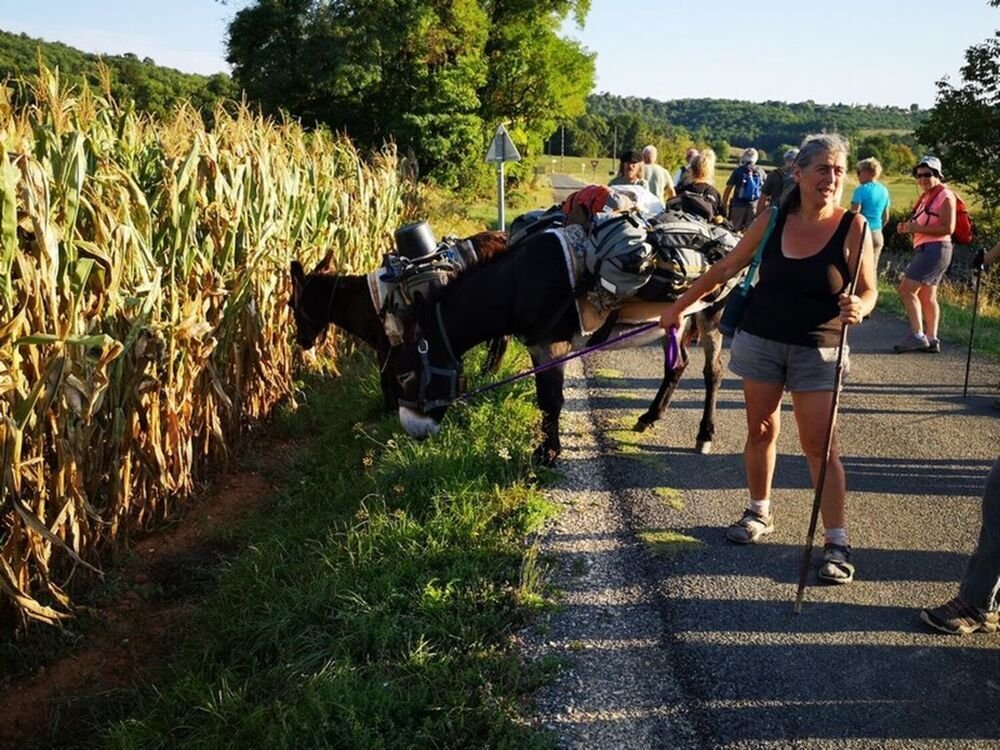 Direction plein sud longeant les vieilles rues aux noms occitans du bourg en suivant le GR 652, sur le chemin nous croisons un curieux attelage composé de deux ânes bâtés et de leurs compagnons, un couple et un chien, partis de Pau et parcourant le sud-ouest.