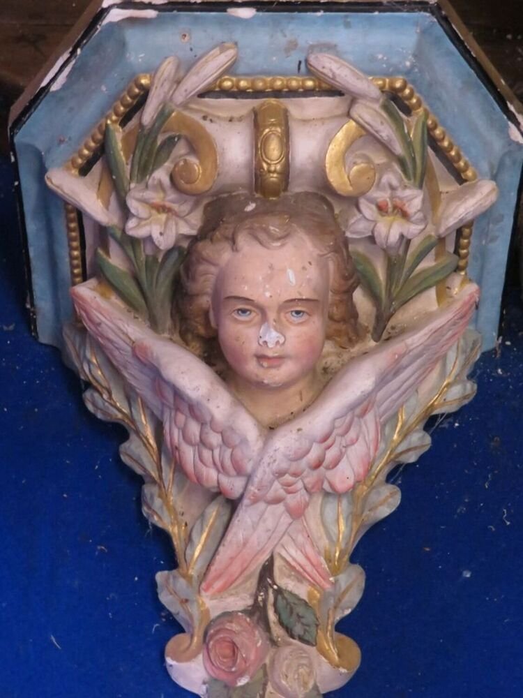 Nous pouvons voir de nombreux tacherons dans les murs de l’église et un très vieux Tabernacle en bois doré de la fin du XVII siècle.