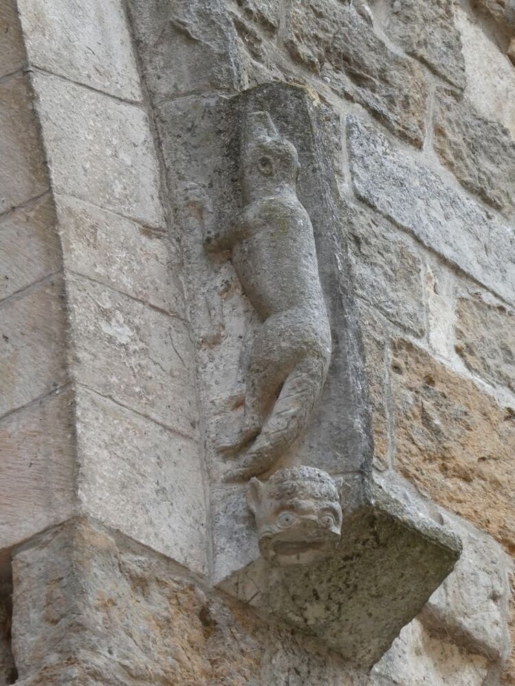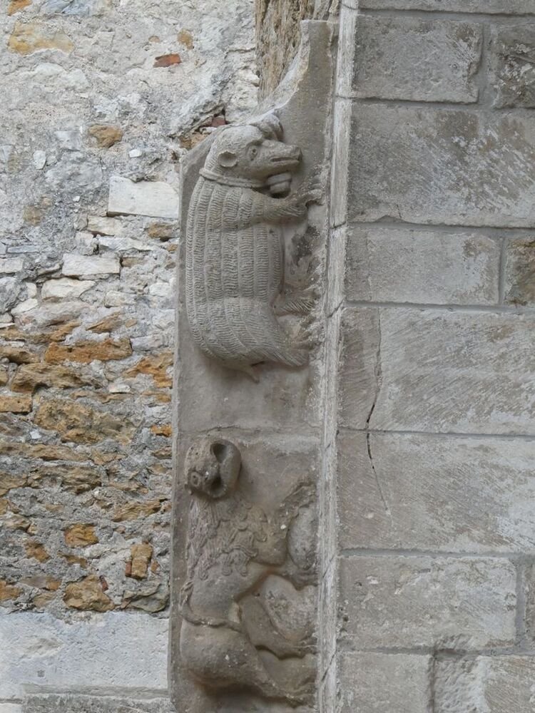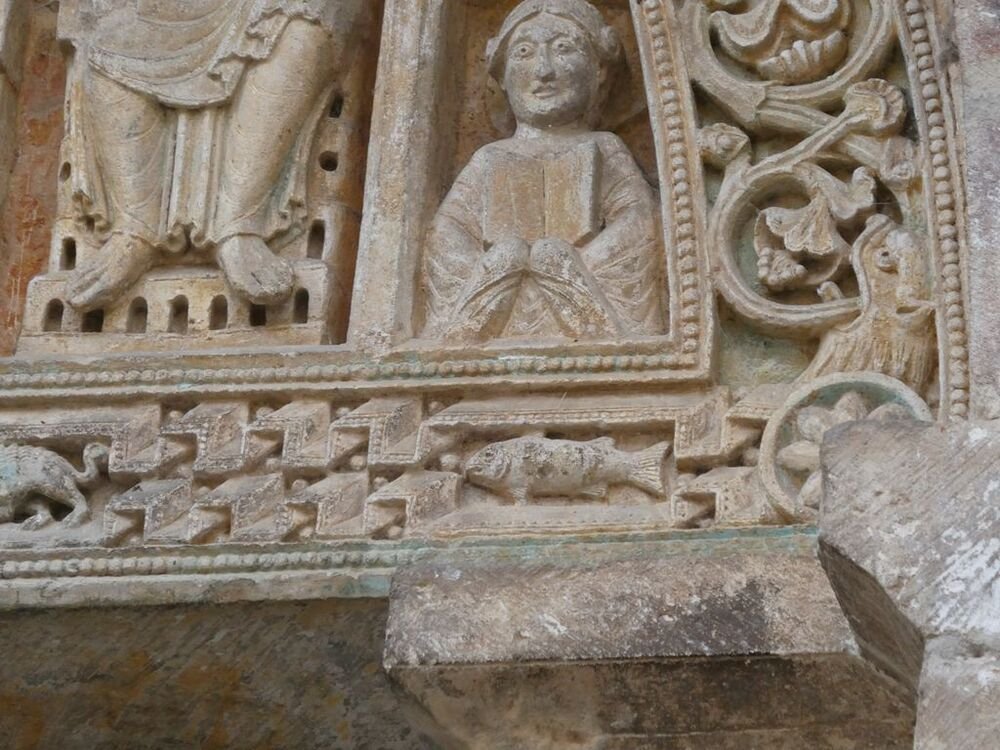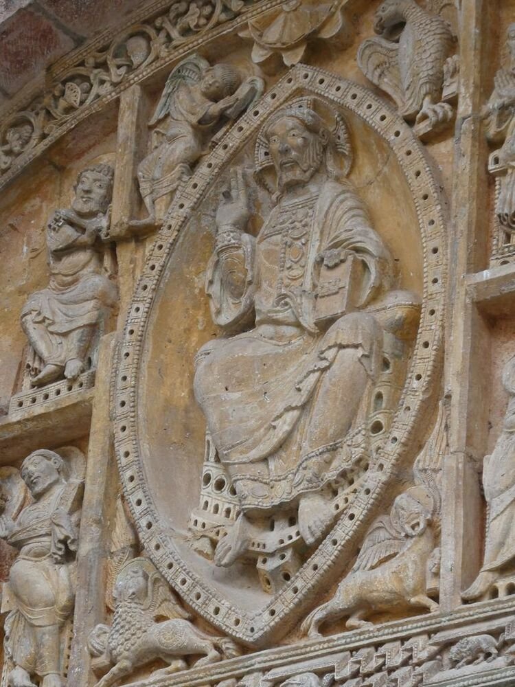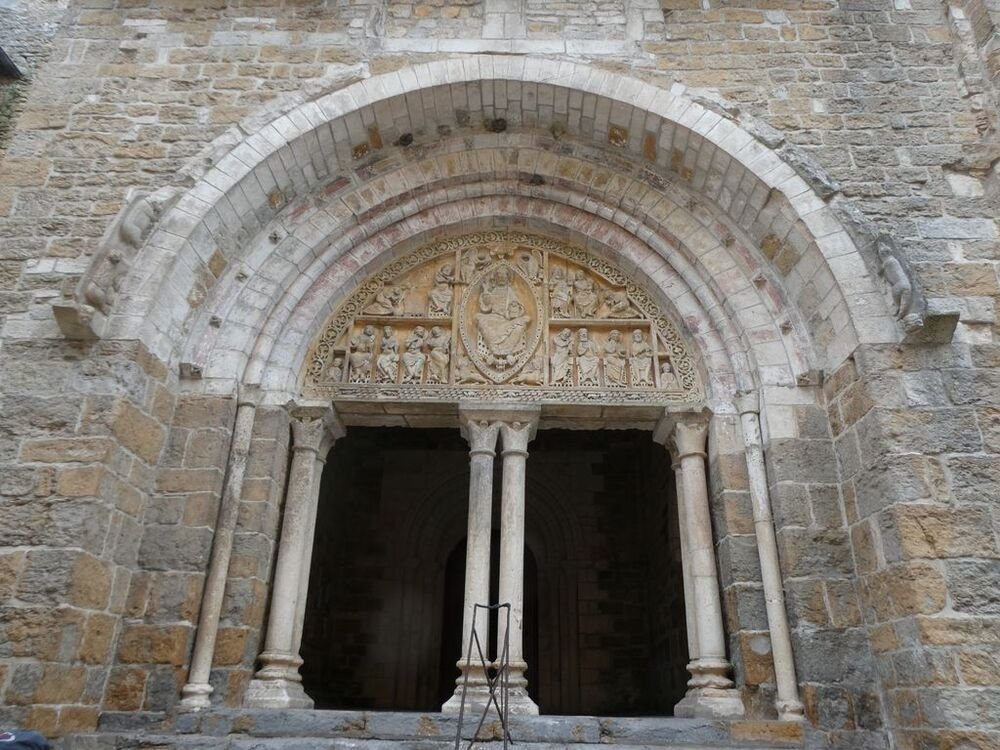 Nos pas nous conduisent vers l’église Saint-Pierre bâtie à la fin du XIe siècle et agrandie au cours du XIIe par la construction d’un porche orné d’un magnifique tympan sculpté. Le Christ en majesté est entouré par les symboles des quatre évangélistes : l’Ange pour Mathieu, l’Aigle pour Jean, le Taureau pour Luc et le Lion pour Marc. Le portail de l’entrée de l’église, daté du XIe, est orné de chapiteaux sculptés d’animaux fantastiques, d’entrelacs et de palmettes. La nef est couverte d’une voûte en berceau, renforcée par des arcs doubleaux. C’est une coupole sur pendentifs qui couvre la croisée du transept.