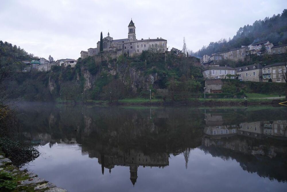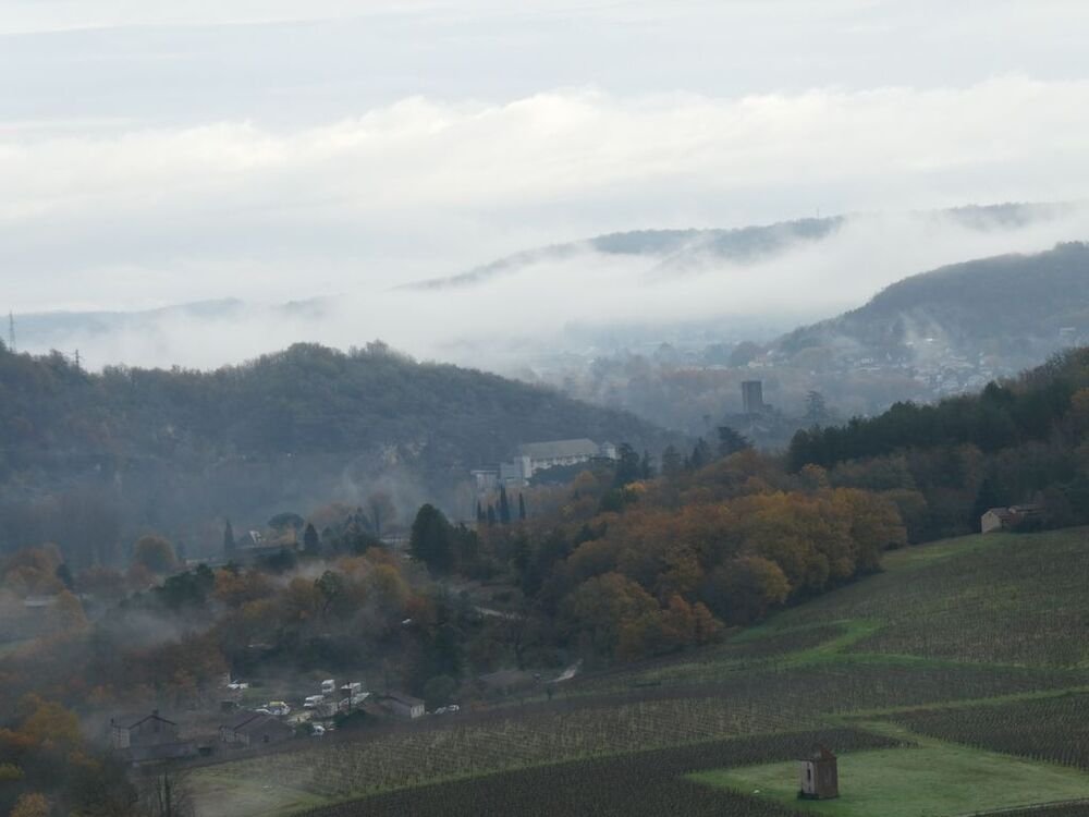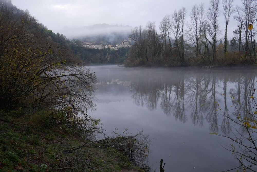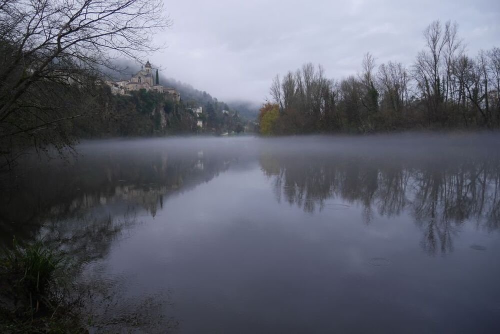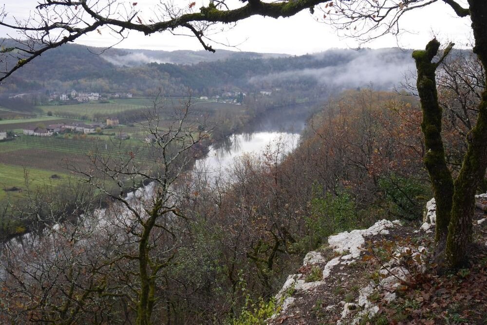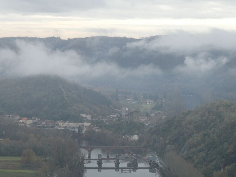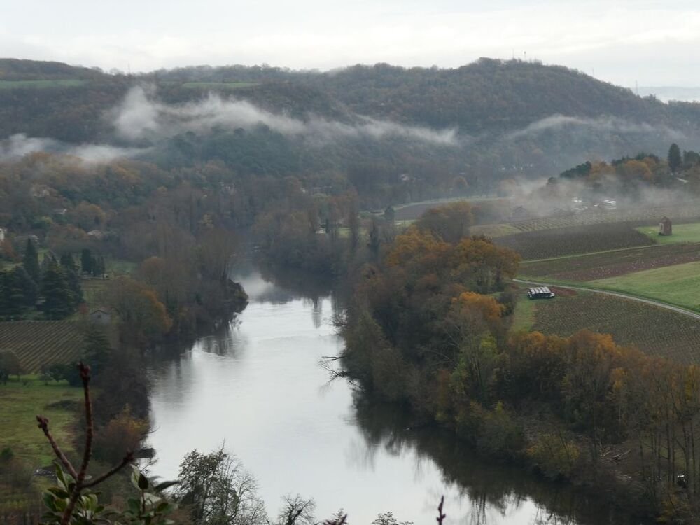 Celui-ci, hissé sur son éperon rocheux, se mire voluptueusement dans les eaux calmes du Lot, ceints de légères brumes.