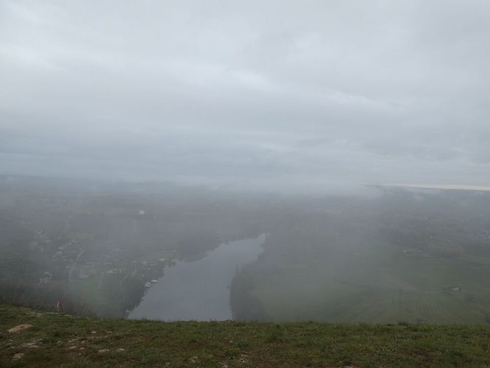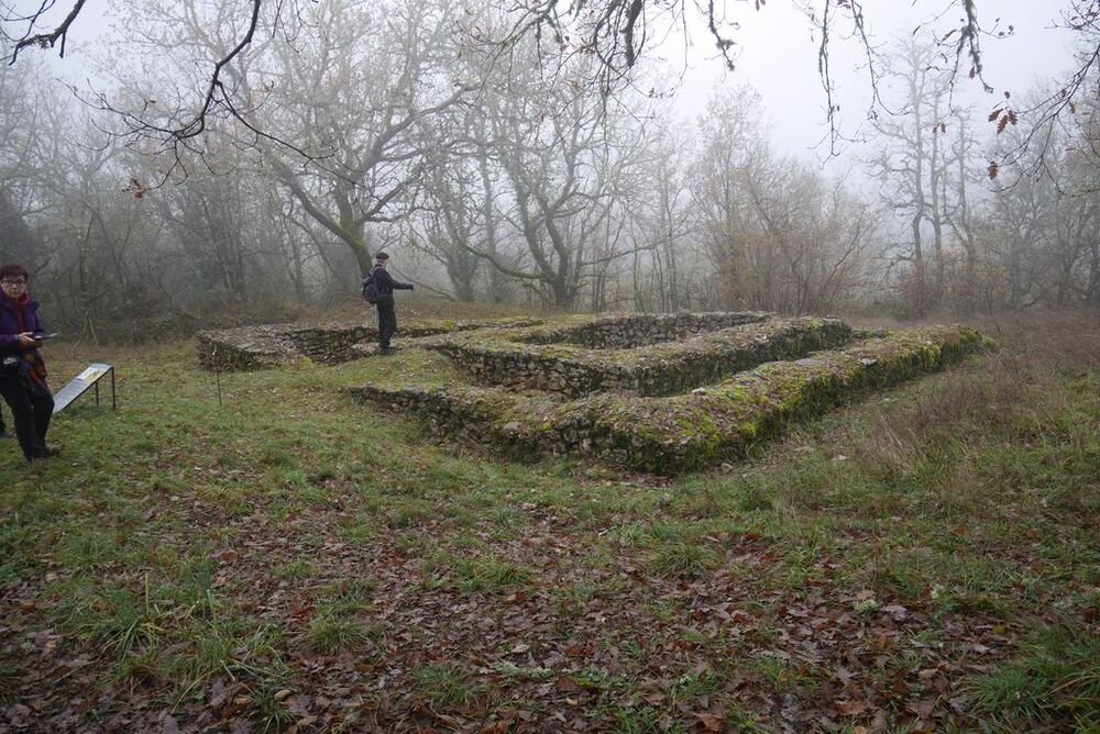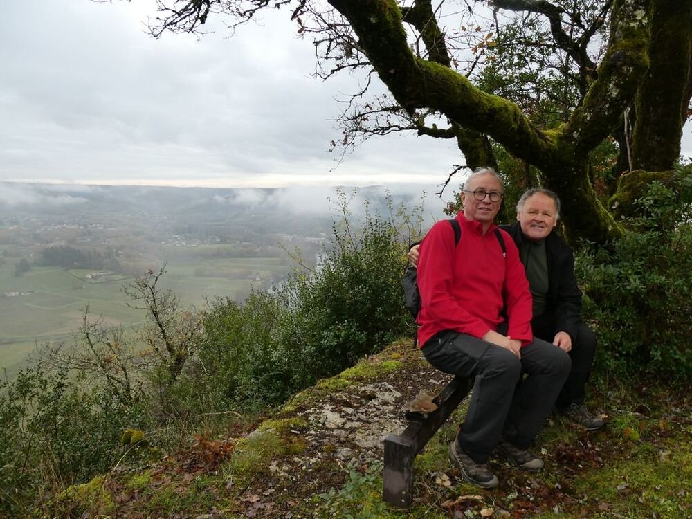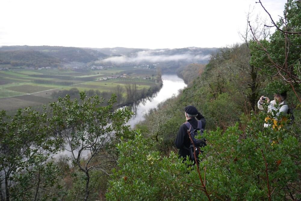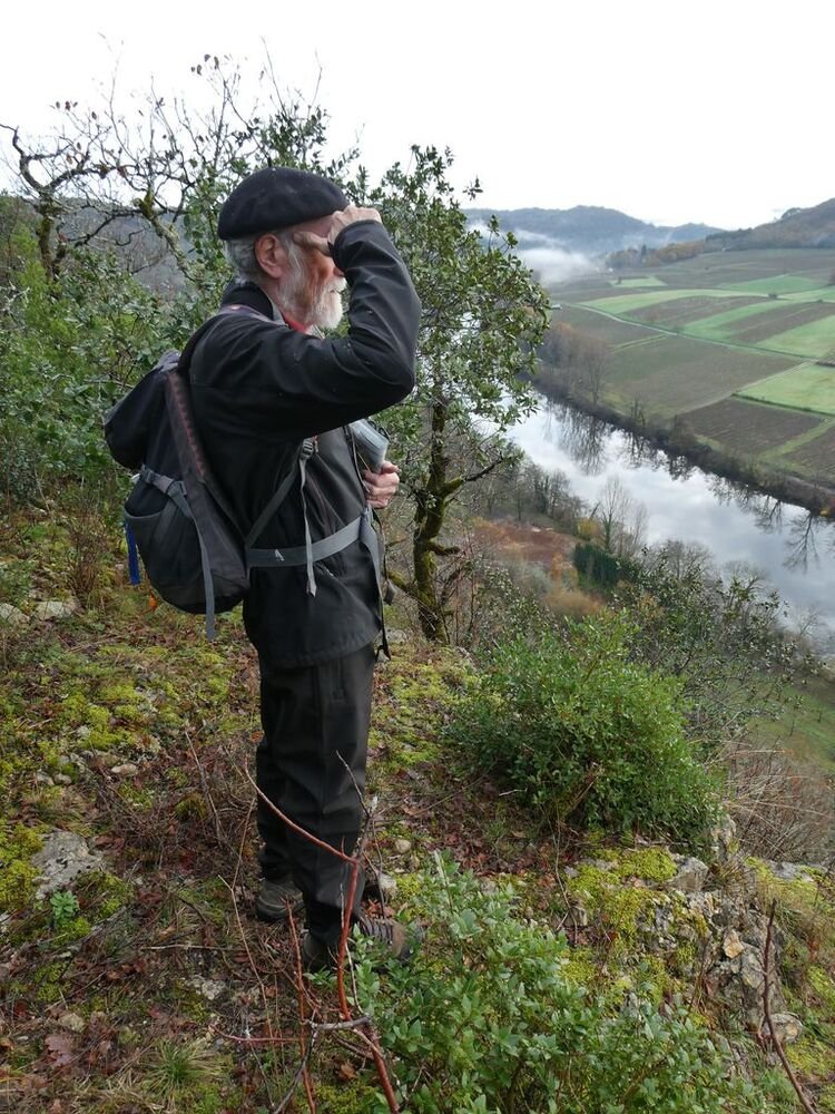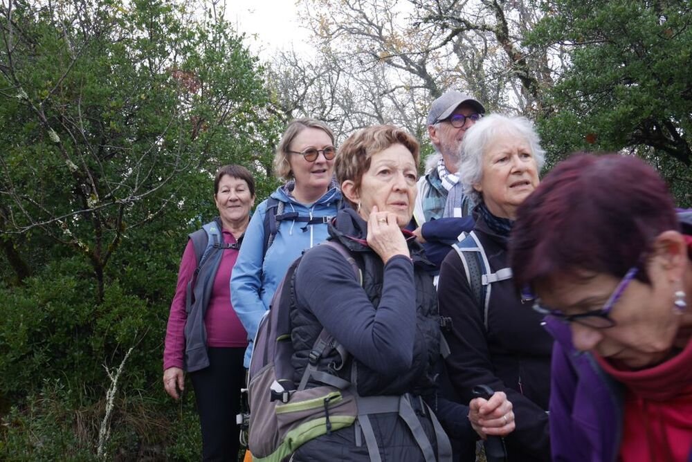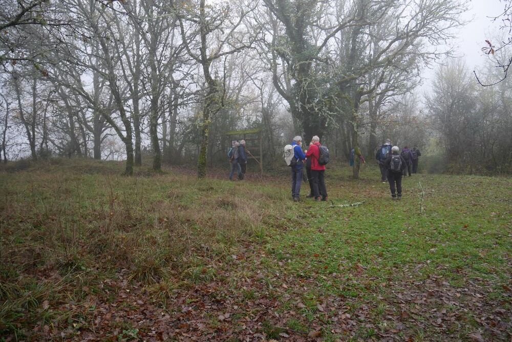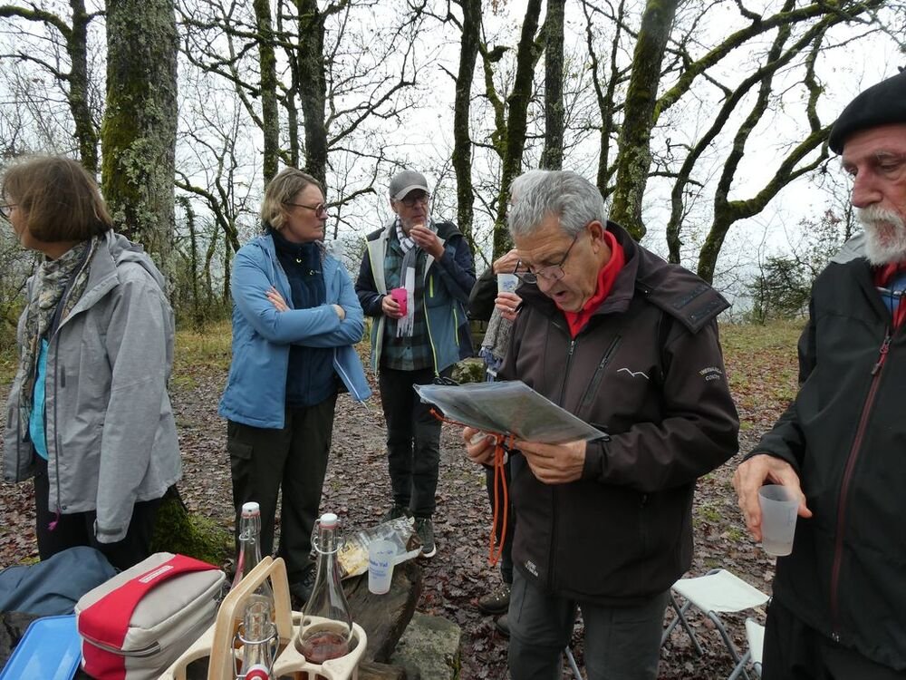 Après la pause-café bienvenue, nous parcourons le chemin des crêtes et repérons sur la carte le dolmen dont il ne reste que la table basse, avant d’atteindre la « Cévenne de Caix » dévoilant un panorama étendu sur le single de Luzech, le hameau de Caix, le méandre de Parnac et au loin le château de Mercuès, malgré un brouillard diffus .