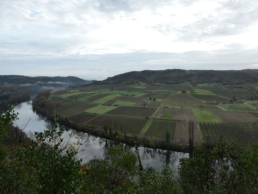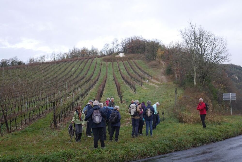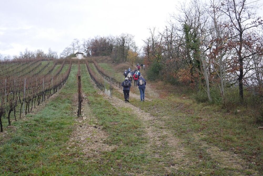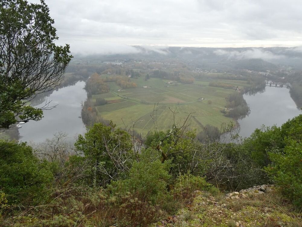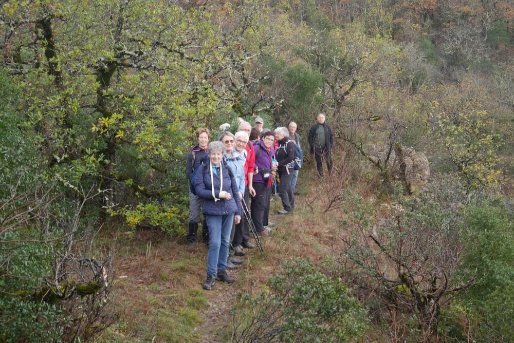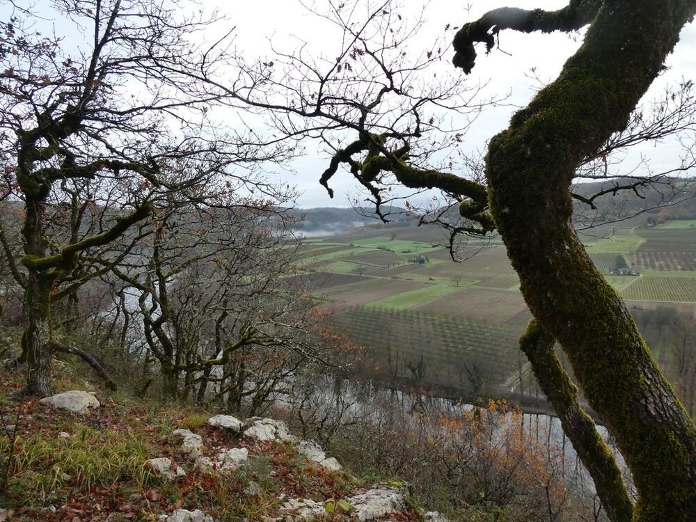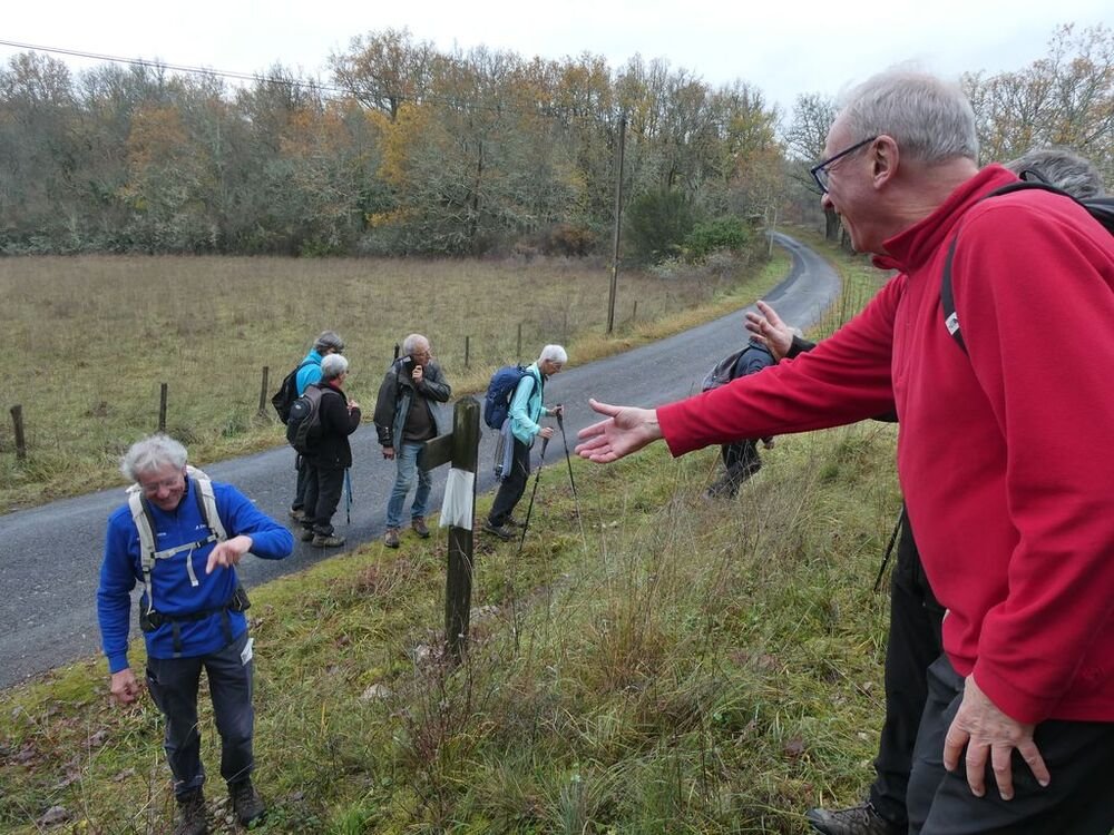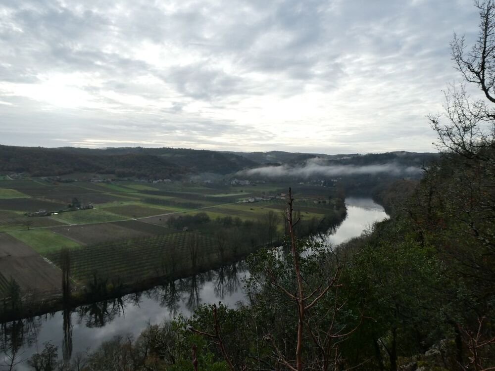 Après la pause-café bienvenue, nous parcourons le chemin des crêtes et repérons sur la carte le dolmen dont il ne reste que la table basse, avant d’atteindre la « Cévenne de Caix » dévoilant un panorama étendu sur le single de Luzech, le hameau de Caix, le méandre de Parnac et au loin le château de Mercuès, malgré un brouillard diffus .