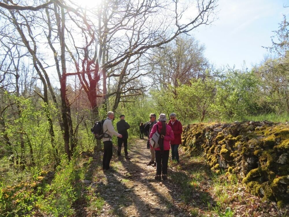 C’est l’odeur des feux de paille allumés durant la nuit par les vignerons pour lutter contre le gel qui accueille les 18 marcheuses et marcheurs venus jusqu’à Floressas pour un circuit d’une dizaine de km. Malgré les nappes de fumée dégagées par les brûlots pour créer un nuage protecteur sur les vignes, le ciel reste d’un bleu étincelant et le soleil est bien au rendez-vous, mais il ne nous réchauffe pas encore ! D’autant plus que nous commençons notre parcours en descendant vers le vallon des Chambeaux, encore à l’ombre . . . Nous constatons les dégâts occasionnés par les coups de vent et les fortes pluies de l’hiver qui ont fait chuter des arbres et creusé d’énormes ornières sur le chemin.