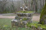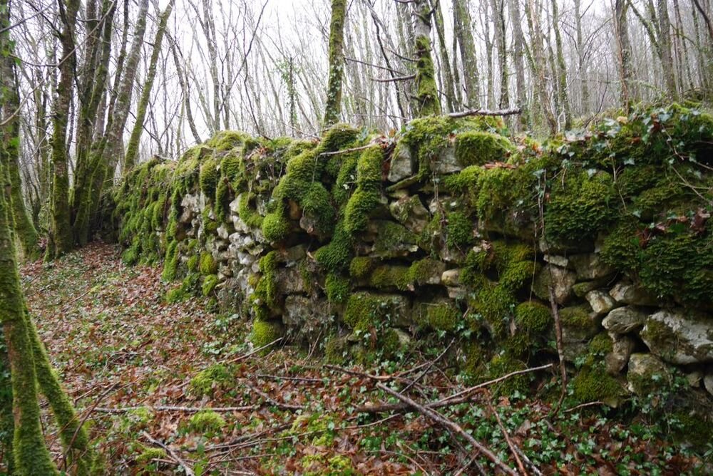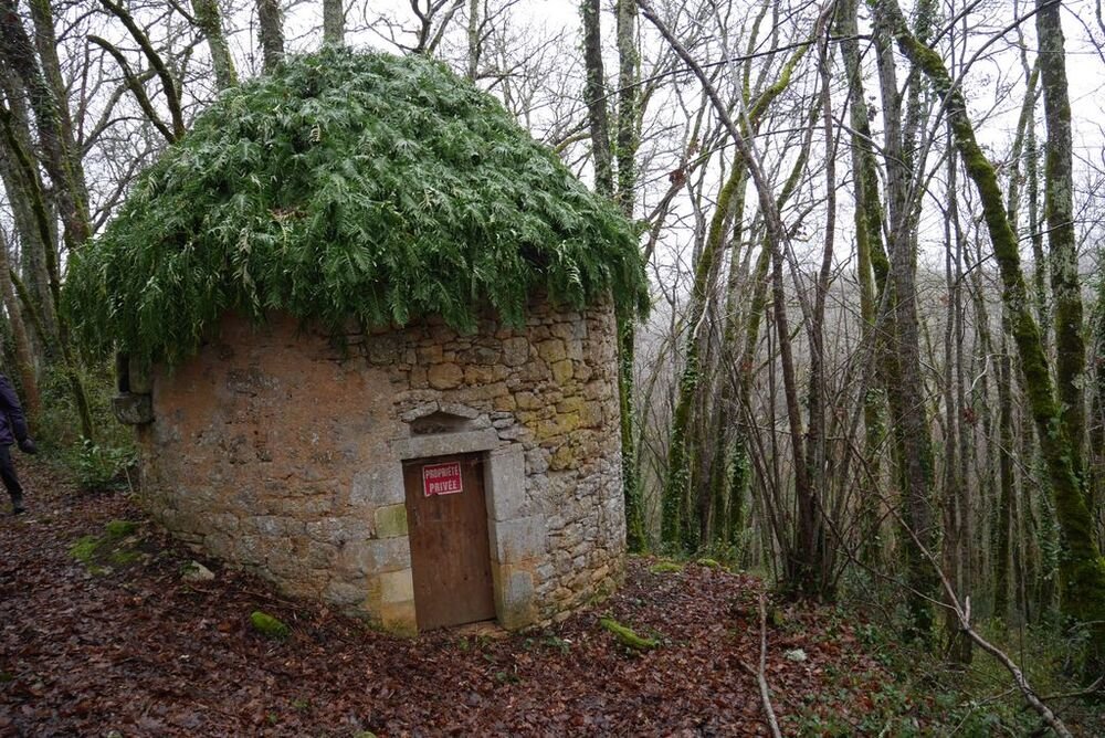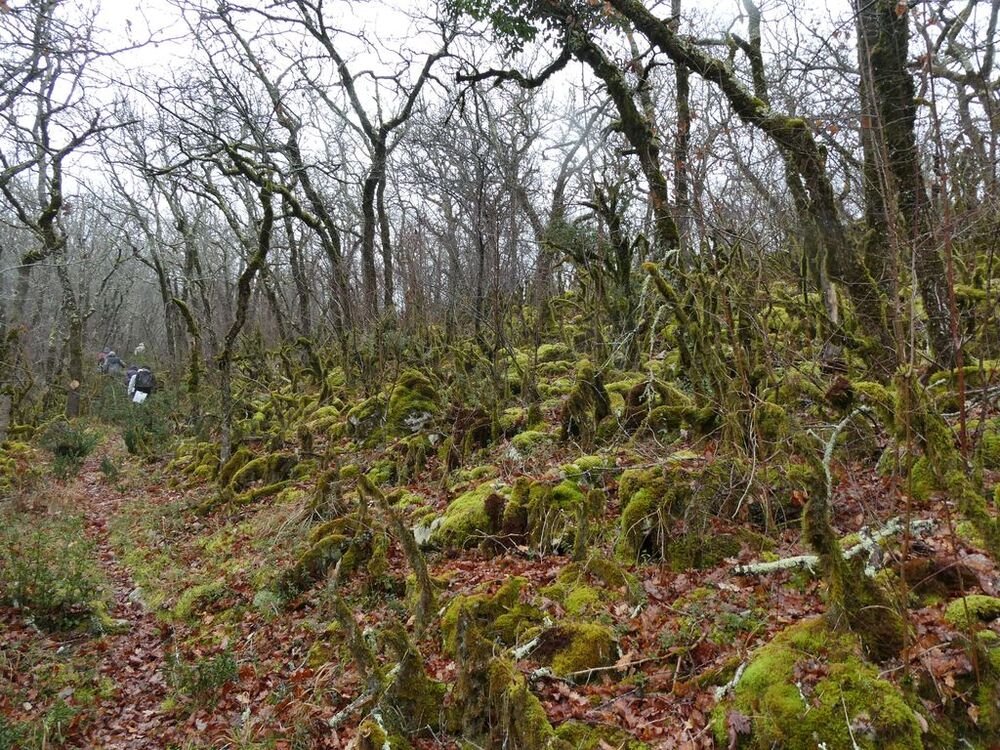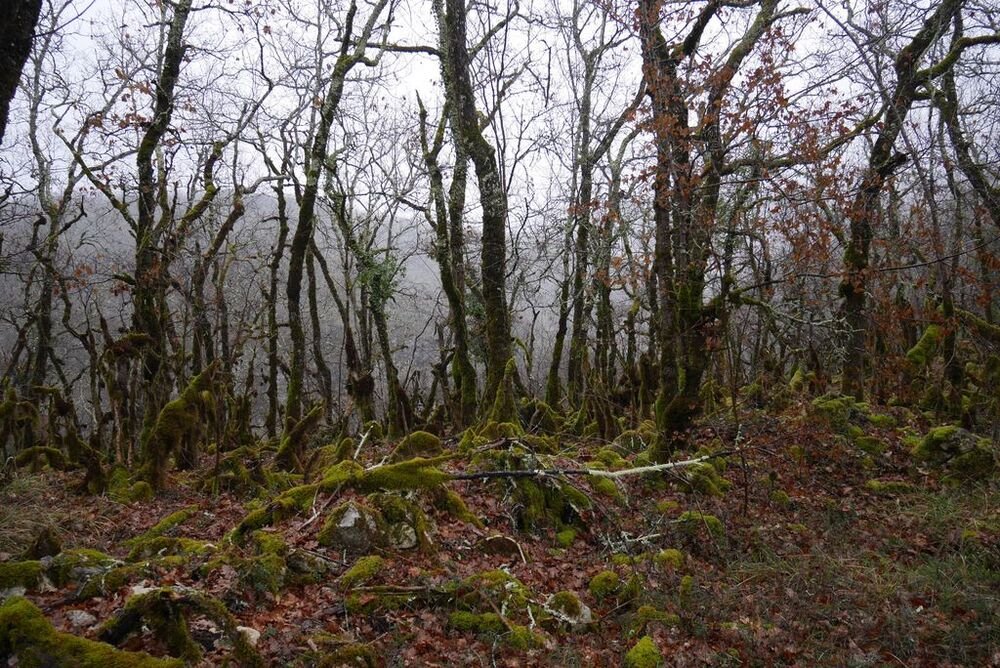 Nous remontons, plein nord, par un sentier escarpé, bifurquons pour admirer le point de vue en surplomb sur la vallée, perturbé par les conditions climatiques, le brouillard et la pluie ne laissant deviner au loin que le clocher-mur de Montcabrier à l’ouest et la plaie géante de la carrière à l’est.