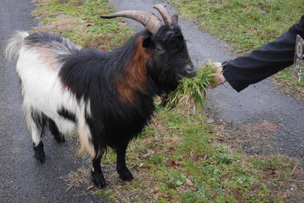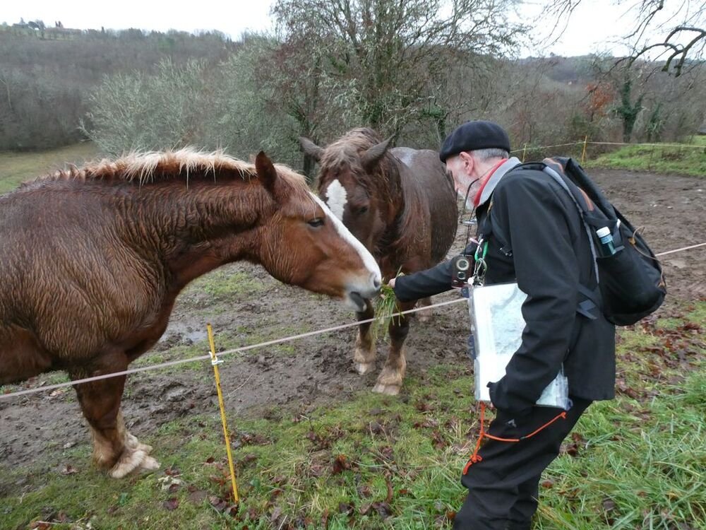Rassasiés, nous continuons sur un sentier herbeux, direction sud, vers le Crabol et la Dolse Haute, rencontrant sur notre chemin de magnifiques chevaux de trait et un bouc facétieux à l’odeur si caractéristique.